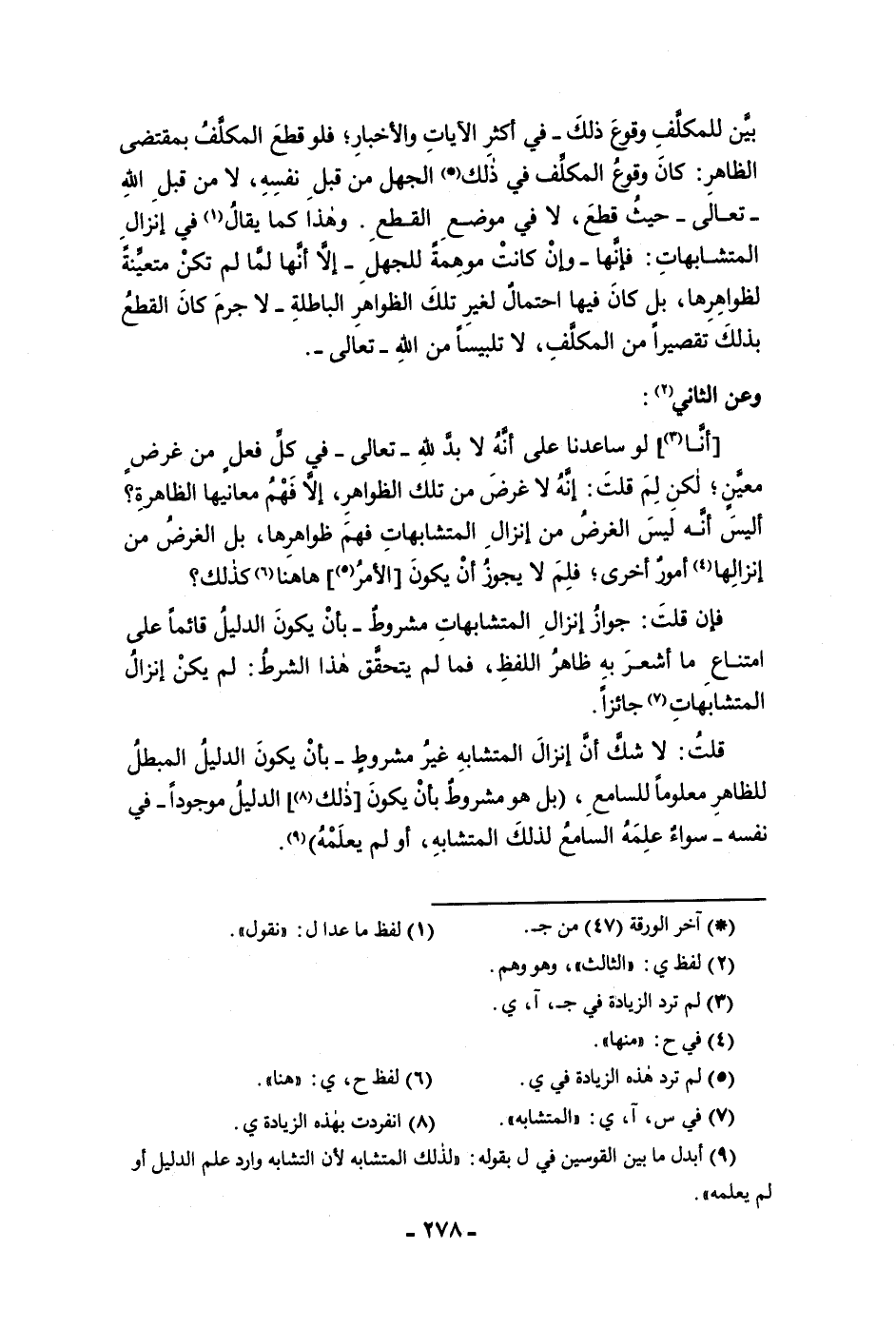 إنزالها أمور أخرى فلم لا يجوز أن يكون الأمر ها هنا كذلك فإن قلت جواز إنزال المتشابهات مشروط بأن يكون الدليل قائما على امتناع ما أشعر به ظاهر اللفظ فما لم يتحقق هذا الشرط لم يكن إنزال المتشابهات جائزا قلت لا شك أن إنزال المتشابه غير مشروط بأن يكون الدليل المبطل للظاهر معلوما للسامع بل هو مشروط بأن يكون ذلك الدليل موجودا في نفسه سواء علمه السامع لذلك المتشابه أو لم يعلمه