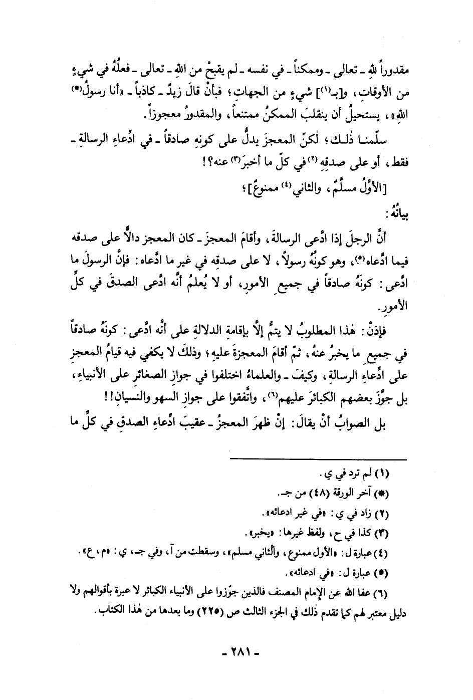 مقدورا لله تعالى وممكنا في نفسه لم يقبح من الله تعالى فعله في شئ من الأوقات وبشئ من الجهات فبأن قال زيد كاذبا أنا رسول الله يستحيل أن ينقلب الممكن ممتنعا والمقدور معجوزا سلمنا ذلك لكن المعجز يدل على كونه صادقا في ادعاء الرسالة فقط أو على صدقه في كل ما أخبر عنه الأول مسلم والثاني ممنوع بيانه أن يكون إذا ادعى الرسالة وأقام المعجز كان المعجز دالا على صدقه فيما ادعاه وهو كونه رسولا لا على صدقه في غير ما ادعاه فإن الرسول ما ادعى كونه صادقا في جميع الأمور أو لا يعلم أنه ادعى الصدق في كل الأمور فإذن هذا المطلوب لا يتم إلا بإقامة الدلالة على أنه ادعى كونه صادقا في جميع ما يخبر عنه ثم أقام المعجزة عليه وذلك لا يكفي فيه قيام المعجز على ادعاء الرسالة وكيف والعلماء اختلفوا في جواز الصغائر على الأنبياء بل جوز بعضهم الكبائر عليهم واتفقوا على جواز السهو والنسيان بل الصواب أن يقال إن ظهر المعجز عقيب ادعاء الصدق في كل ما