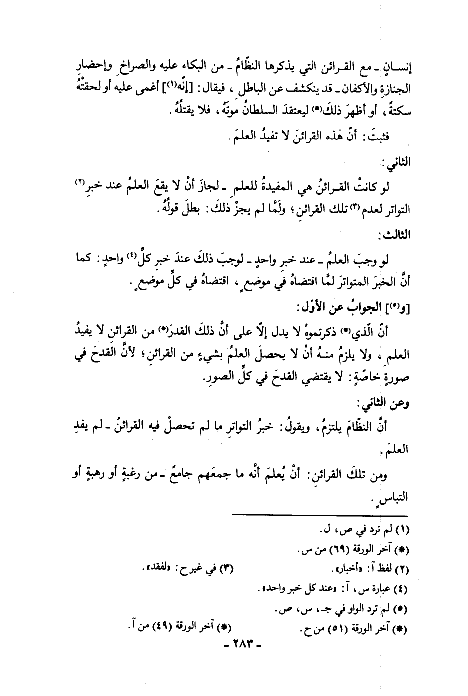 الثاني لو كانت القرائن هي المفيدة للعلم لجاز أن لا يقع العلم عند خبر التواتر لعدم تلك القرائن ولما لم يجز ذلك بطل قوله الثالث لو وجب العلم عند خبر واحد لوجب ذلك عند خبر كل واحد كما أن الخبر المتواتر لما اقتضاه في موضع اقتضاه في كل موضع والجواب عن الأول أن الذي ذكرتموه لا يدل إلا على أن ذلك القدر من القرائن لا يفيد العلم ولا يلزم منه أن لا يحصل العلم بشئ من القرائن لأن القدح في صورة خاصة لا يقتضي القدح في كل الصور وعن الثاني أن النظام يلتزم ويقول خبر التواتر ما لم تحصل فيه القرائن لم يفد العلم ومن تلك القرائن أن يعلم أنه ما جمعهم جامع من رغبة أو رهبة أو التباس