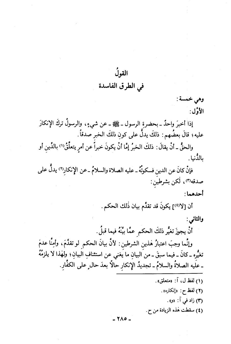 القول في الطرق الفاسدة وهي خمسة الأول إذا أخبر واحد بحضرة الرسول صلى الله عليه وسلم عن شئ والرسول ترك الإنكار