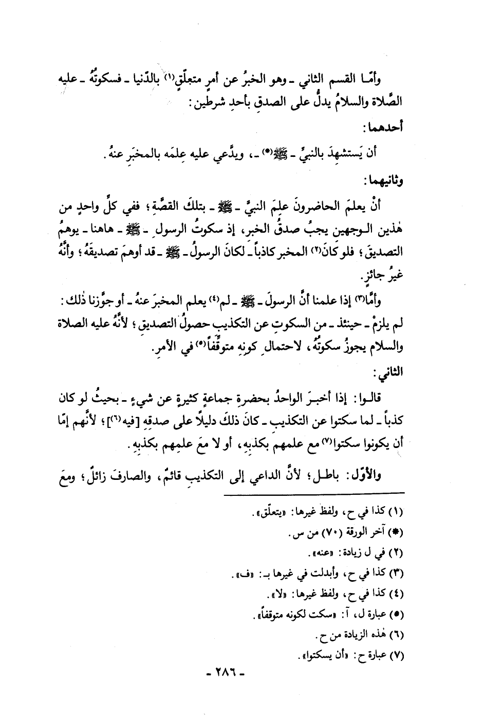 وأما القسم الثاني وهو الخبر عن أمر متعلق بالدنيا فسكوته عليه الصلاة والسلام يدل على الصدق بأحد شرطين أحدهما أن يستشهد بالنبي صلى الله عليه وسلم ويدعي عليه علمه بالمخبر عنه وثانيهما أن يعلم الحاضرون علم النبي صلى الله عليه وسلم بتلك القصة ففي كل واحد من هذين الوجهين يجب صدق الخبر إذ سكوت الرسول صلى الله عليه وسلم ها هنا يوهم التصديق فلو كان المخبر كاذبا لكان الرسول صلى الله عليه وسلم قد أوهم تصديقه وأنه غير جائز