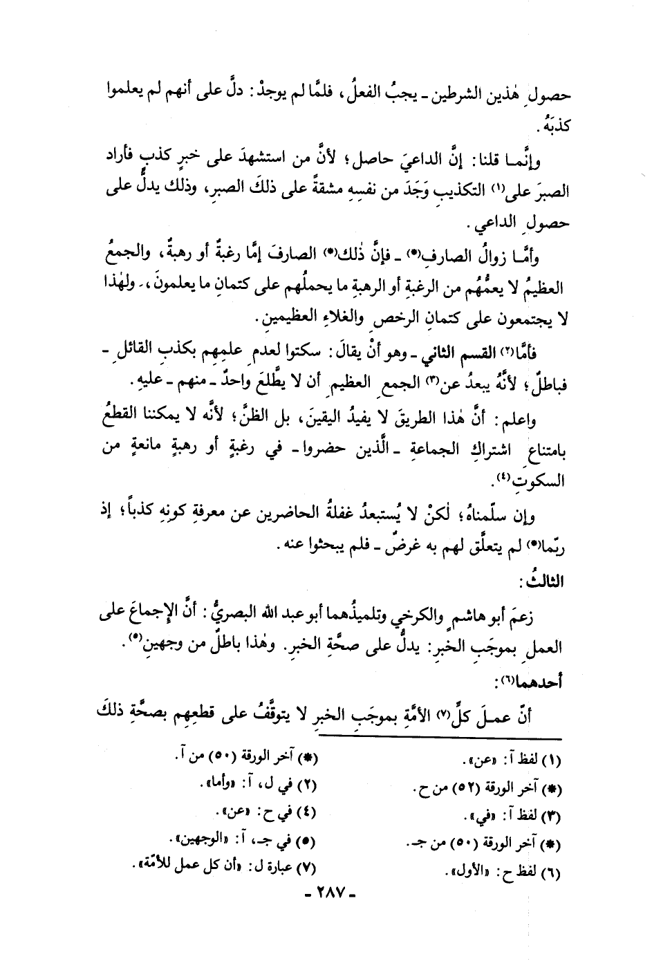 وإن سلمناه لكن لا يستبعد غفلة الحاضرين عن معرفة كونه كذبا إذ ربما لم يتعلق لهم به غرض فلم يبحثوا عنه الثالث زعم أبو هاشم والكرخي وتلميذهما أبو عبد الله البصري أن الإجماع على العمل بموجب الخبر يدل على صحة الخبر وهذا باطل من وجهين أحدهما أن عمل كل الأمة بموجب الخبر لا يتوقف على قطعهم بصحة ذلك