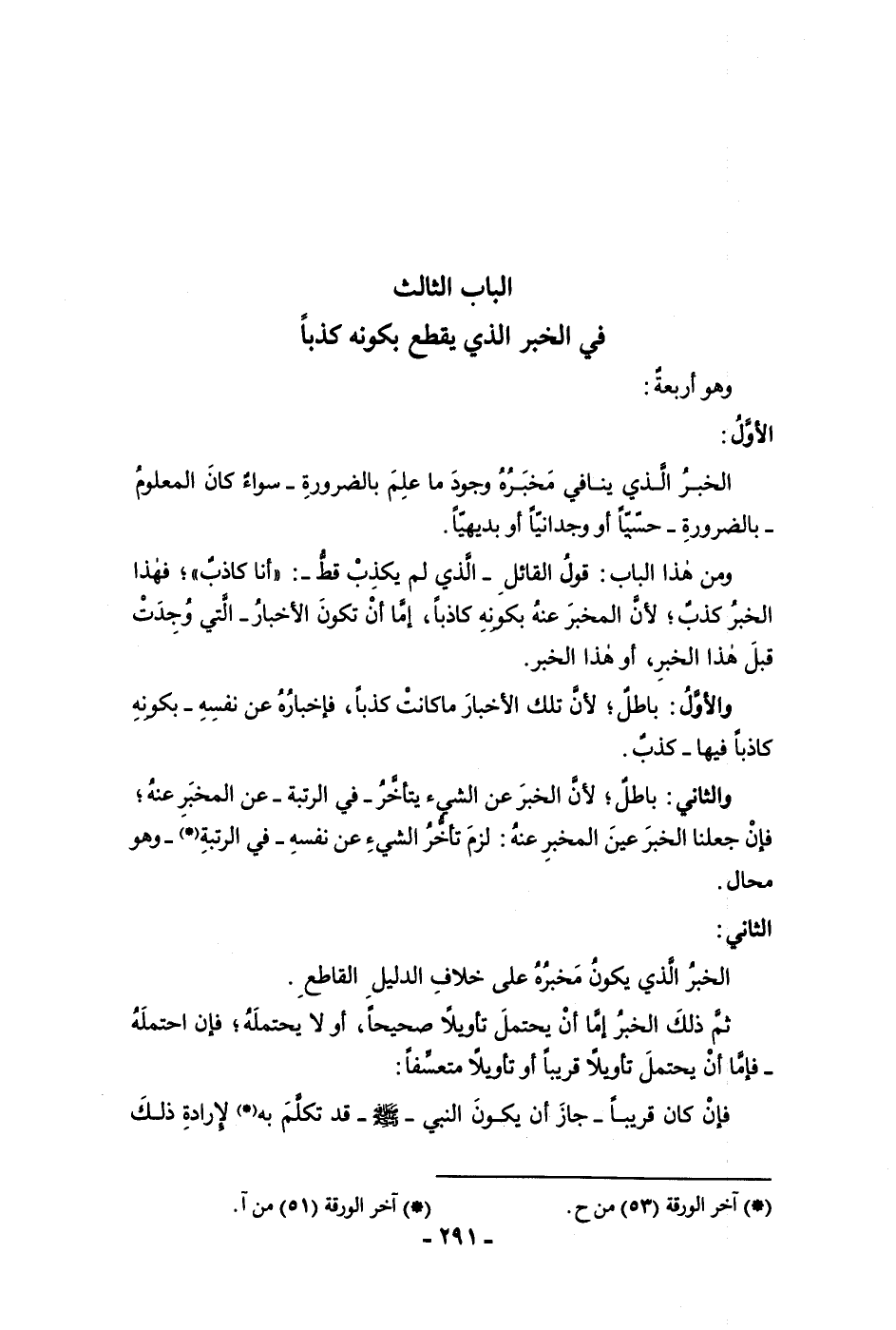 الباب الثالث في الخبر الذي يقطع بكونه كذبا وهو أربعة الأول الخبر الذي ينافي مخبره وجود ما علم بالضرورة سواء كان المعلوم بالضرورة حسيا أو وجدانيا أو بديهيا ومن هذا الباب قول القائل الذي لم يكذب قط أنا كاذب فهذا الخبر كذب لأن المخبر عنه بكونه كاذبا إما أن تكون الأخبار التي وجدت قبل هذا الخبر أو هذا الخبر والأول باطل لأن تلك الأخبار ما كانت كذبا فإخباره عن نفسه بكونه كاذبا فيها كذب والثاني باطل لأن الخبر عن الشئ يتأخر في الرتبة عن المخبر عنه فإن جعلنا الخبر عين المخبر عنه لزم تأخر الشئ عن نفسه في الرتبة وهو محال الثاني