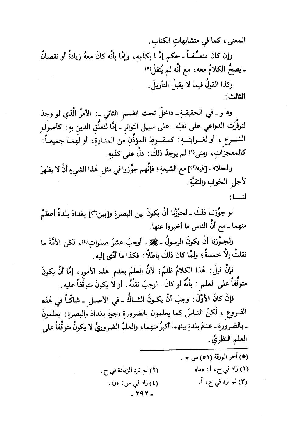 المعنى كما في متشابهات الكتاب وإن كان متعسفا حكم إما بكذبه وإما بأنه كان معه زيادة أو نقصان يصح الكلام معه مع أنه لم ينقل وكذا القول فيما لا يقبل التأويل الثالث وهو في الحقيقة داخل تحت القسم الثاني الأمر الذي لو وجد لتوفرت الدواعي على نقله على سبيل التواتر إما لتعلق الدين به كأصول الشرع أو لغرابته كسقوط المؤذن من المنارة أو لهما جميعا كالمعجزات ومتى لم يوجد ذلك دل على كذبه والخلاف فيه مع الشيعة فإنهم جوزوا في مثل هذا الشئ أن لا يظهر لأجل الخوف والتقية لنا لو جوزنا ذلك لجوزنا أن يكون بين البصرة وبين بغداد بلدة أعظم منهما مع أن الناس ما أخبروا عنها ولجوزنا أن يكون الرسول صلى الله عليه وسلم أوجب عشر صلوات لكن الأمة ما نقلت إلا خمسة ولما كان ذلك باطلا فكذا ما أدى إليه فإن قيل هذا الكلام ظلم لأن العلم بعدم هذه الأمور إما أن يكون متوقفا على العلم بأنه لو كان لوجب نقله أو لا يكون متوقفا عليه