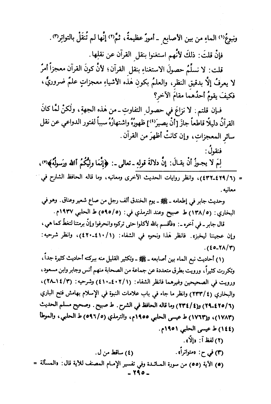 ونبوع الماء من بين الأصابع أمور عظيمة ثم إنها لم تنقل بالتواتر فإن قلت ذلك لأنهم استغنوا بنقل القرآن عن نقلها قلت لا نسلم حصول الاستغناء بنقل القرآن لأن كون القرآن معجزا أمر لا يعرف إلا بدقيق النظر والعلم بكون هذه الأشياء معجزات علم ضروري فكيف يقوم أحدهما مقام الآخر فلأن قلتم لا نزاع في حصول التفاوت من هذه الجهة ولكن لما كان القرآن دليلا قاطعا جاز أن يصير ظهوره واشتهاره سببا لفتور الدواعي عن نقل سائر المعجزات وإن كانت أظهر من القرآن فنقول لم لا يجوز أن يقال إن دلالة قوله تعالى إنما وليكم الله ورسوله
