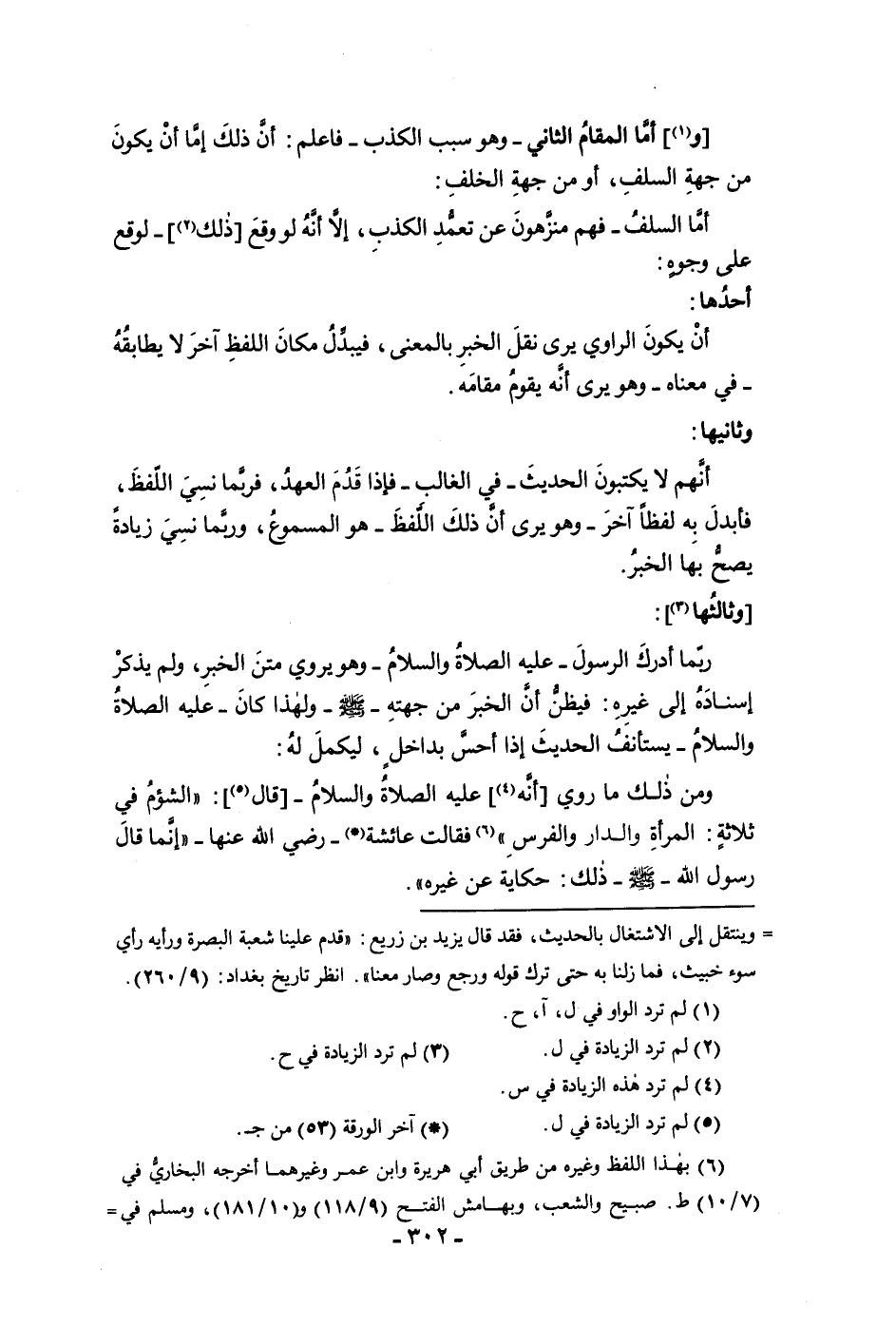 وأما المقام الثاني وهو سبب الكذب فاعلم أن ذلك إما أن يكون من جهة السلف أو من جهة الخلف أما السلف فهم منزهون عن تعمد الكذب إلا أنه لو وقع لوقع ذلك لوقع على وجوه أحدها أن يكون الراوي يرى نقل الخبر بالمعنى فيبدل مكان اللفظ اخر لا يطابقه في معناه وهو يرى أنه يقوم مقامه وثانيها