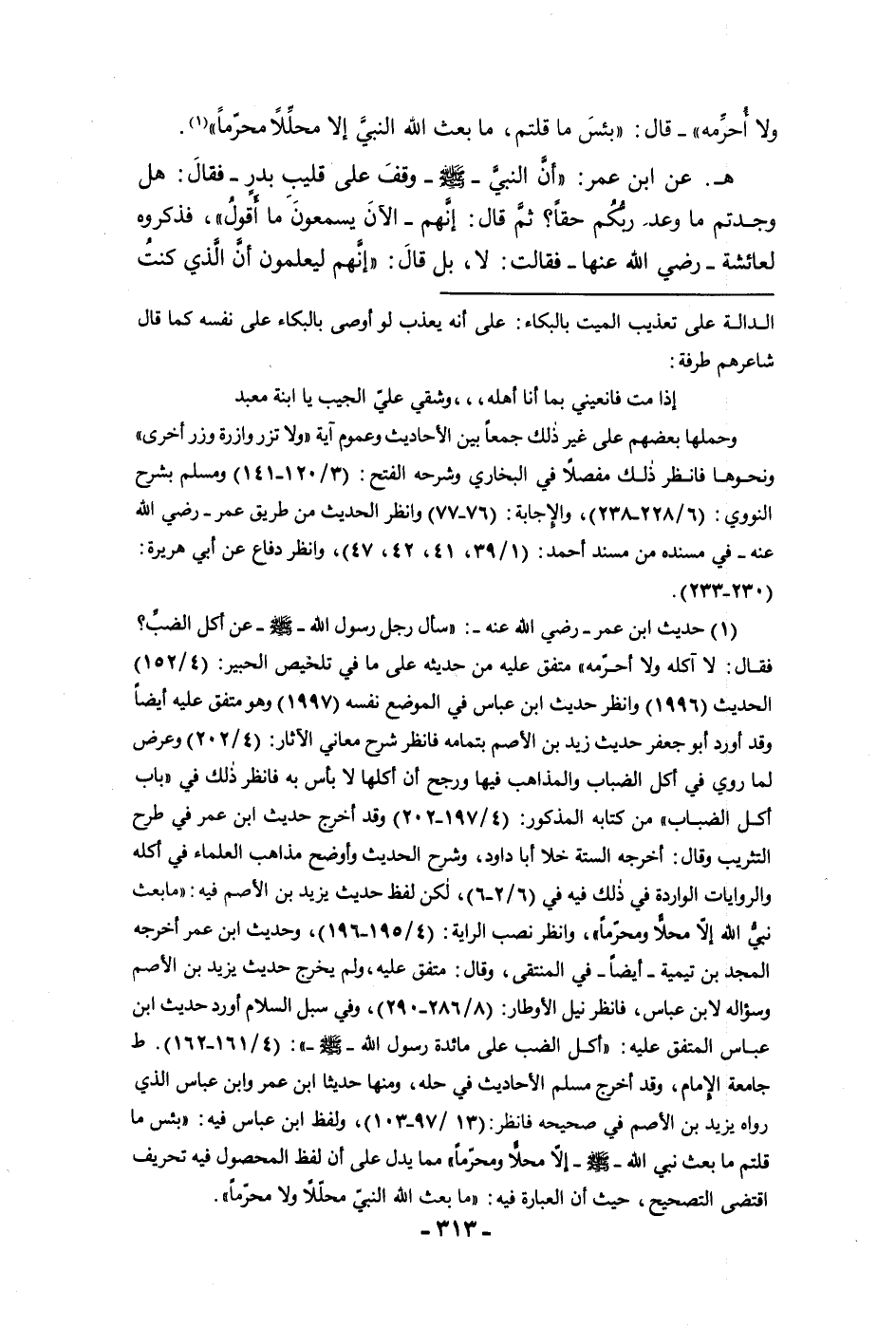 ولا أحرمه قال بئس ما قلتم ما بعث الله النبي محللا ولا محرما هـ عن ابن عمر أن النبي صلى الله عليه وسلم وقف على قليب بدر فقال هل وجدتم ما وعد ربكم حقا ثم قال إنهم الآن يسمعون ما أقول فذكروه لعائشة رضي الله عنها فقالت لا بل قال إنهم ليعلمون أن الذي كنت