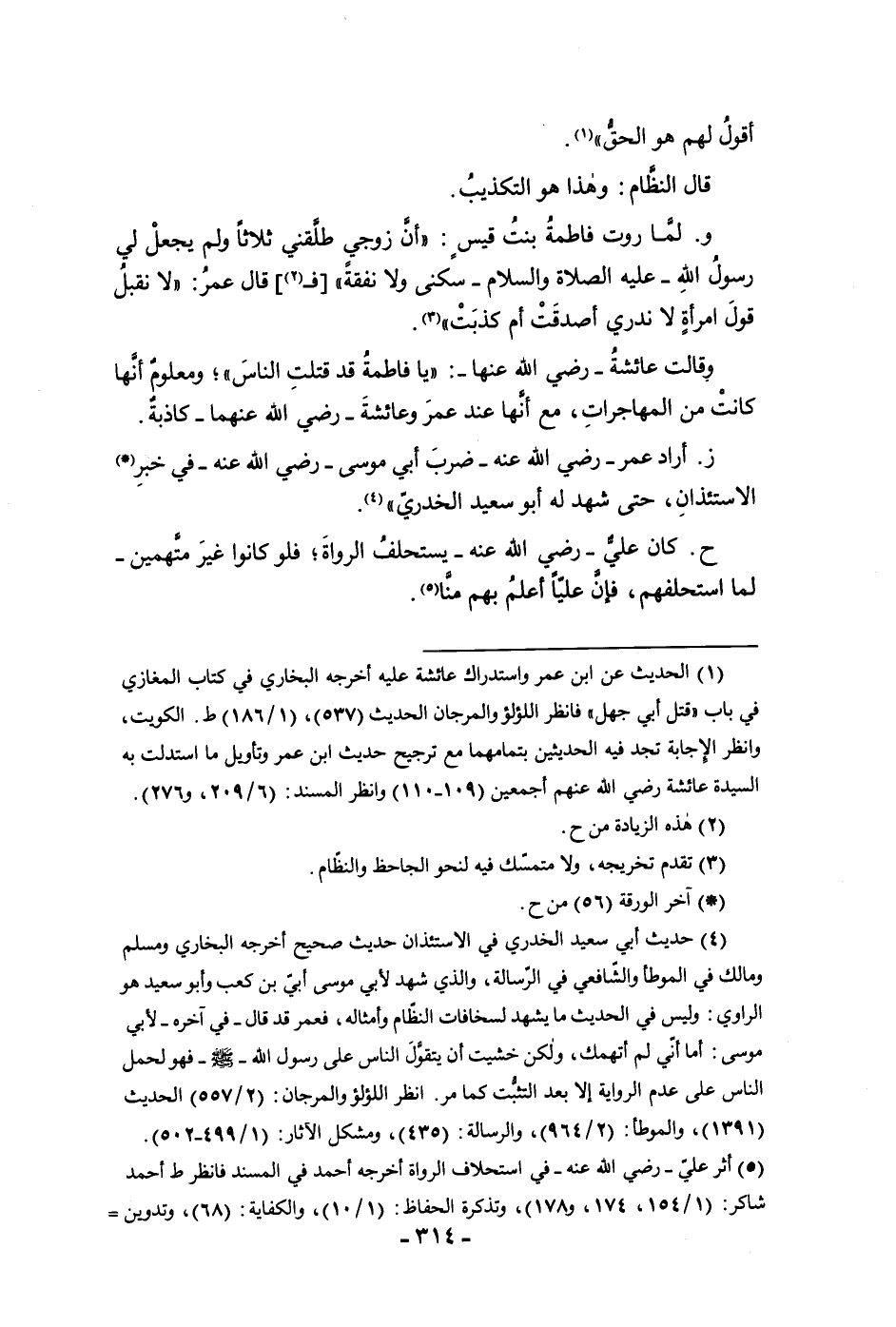 كانت من المهاجرات مع أنها عند عمر وعائشة رضي الله عنهما كاذبة ز أراد وأن عمر رضي الله عنه ضرب أبي موسى رضي الله عنه في خبر الاستيذان حتى شهد له أبو سعيد الخدري ح كان على رضي الله عنه يستحلف الرواة فلو كانوا غير متهمين لما استحلفهم فإن عليا أعلم بهم منا