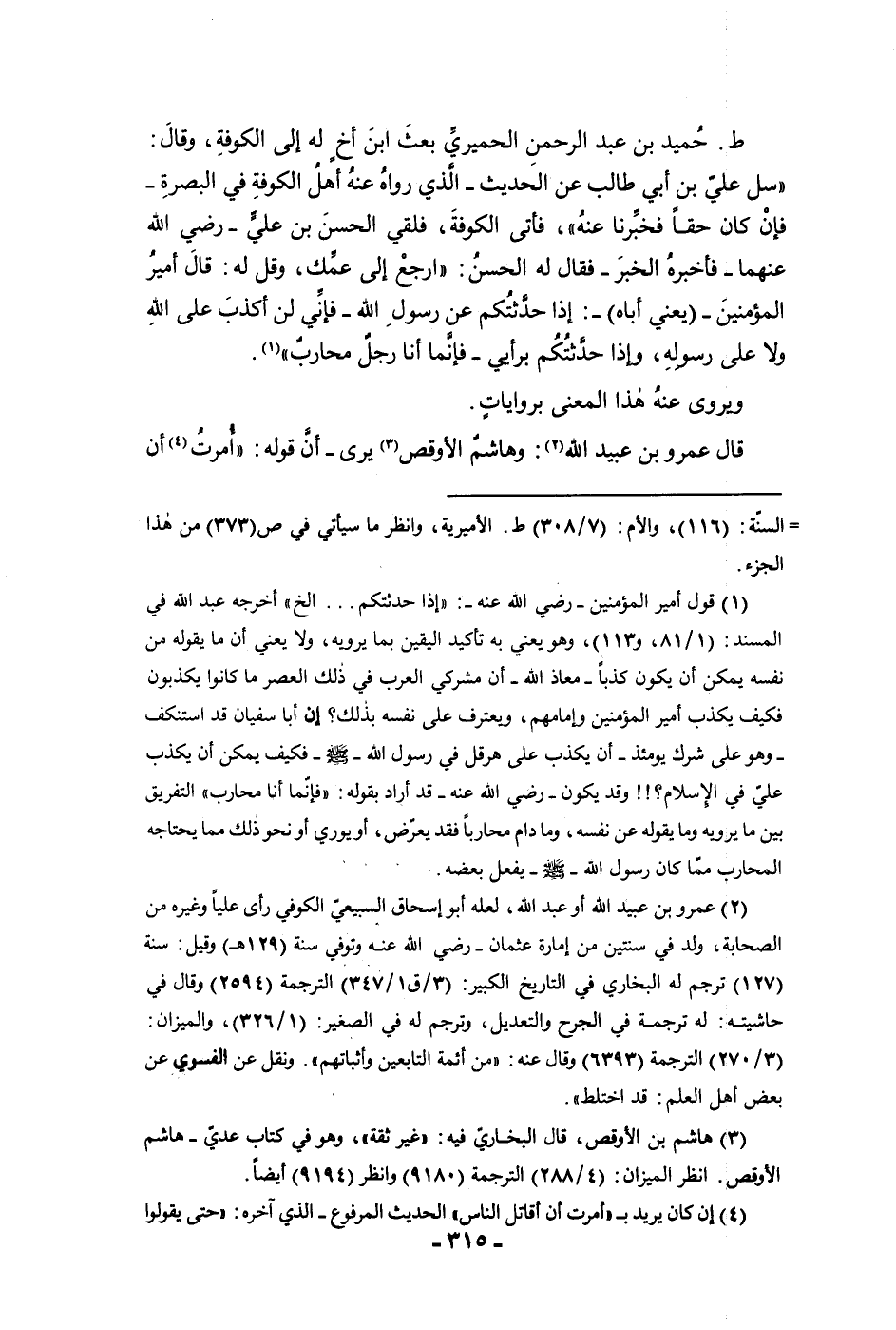 طحميد كما بن عبد الرحمن الحميري بعث أبن أخ له إلى الكوفة وقال سل علي بن أبي طالب عن الحديث الذي رواه عنه أهل الكوفة في البصرة فإن كان حقا فخبرنا عنه فأتى الكوفة فلقى الحسن بن علي رضي الله عنهما فأخبره الخبر فقال له الحسن أرجع إلى عمك وقل له قال أمير المؤمنين يعني أباه إذا حدثتكم عن رسول الله فإني لن أكذ ب على الله ولا على رسوله وإذا حدثتكم برأيي فإنما أنا رجل محارب ويروي عنه هذا المعنى بروايات قال عمرو بن عبيد الله وهاشم الأوقص يرى أن