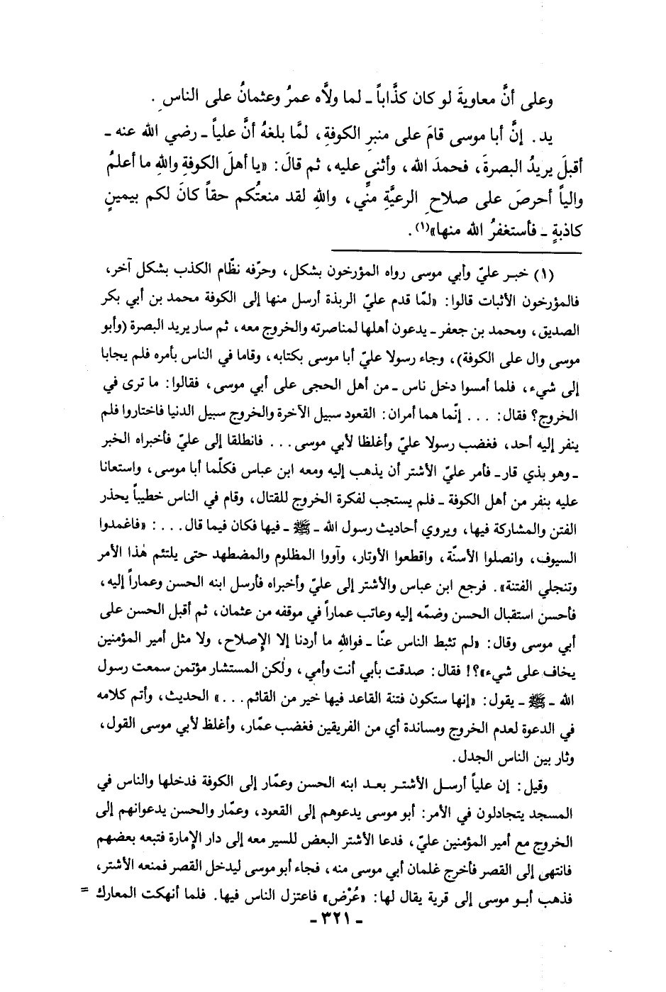 وعلى أن معاوية لو كان كذابا لما ولاه عمر وعثمان على الناس يد إن أبا موسى قام على منبر الكوفة لما بلغه أن عليا رضي الله عنه أقبل يريد البصرة فحمد الله وأثنى عليه ثم قال يا أهل الكوفة والله ما أعلم واليا أحرص على صلاح الرعية مني والله لقد منعتكم حقا كان لكم بيمين كاذبة فأستغفر الله منها