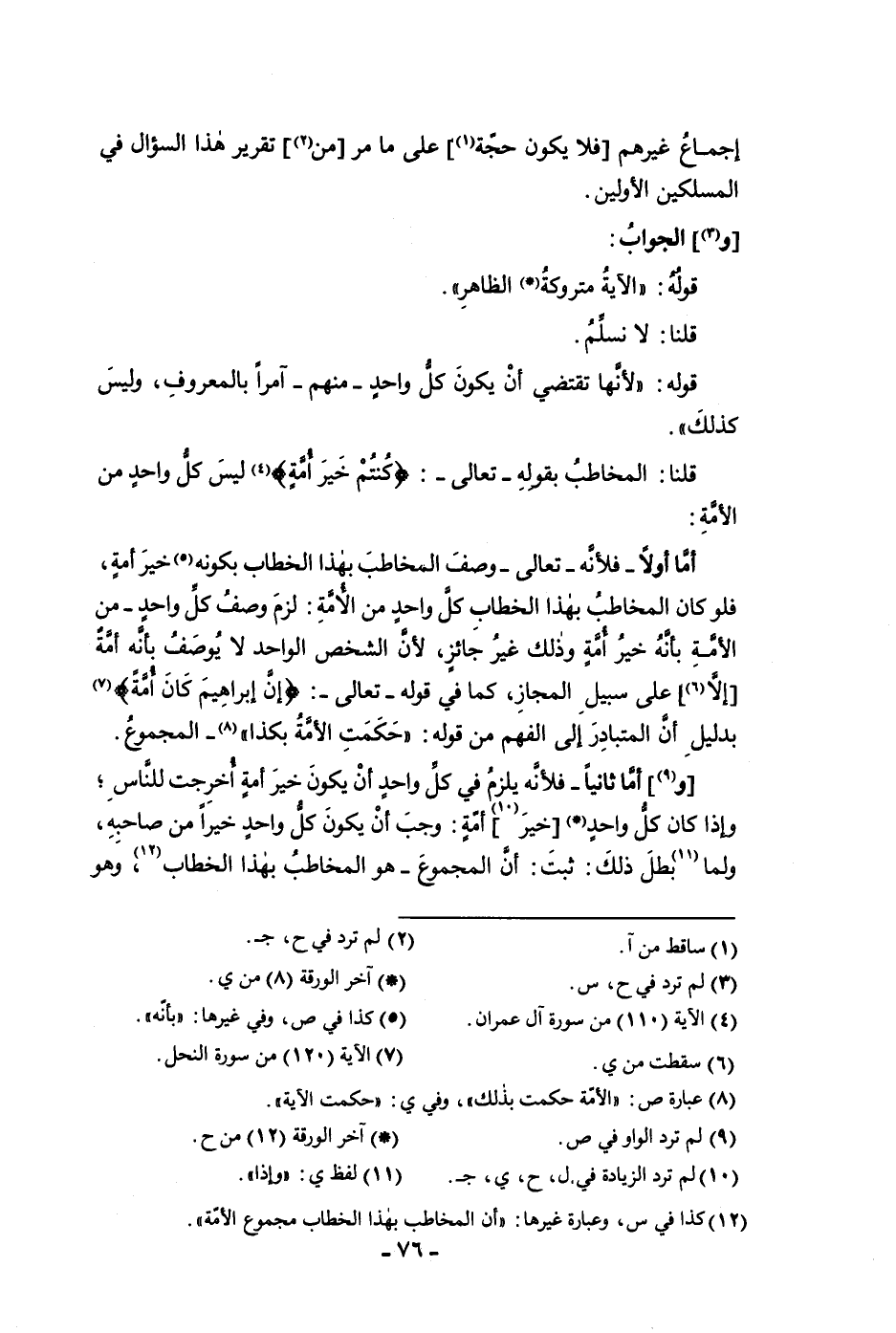 إجماع غيرهم فلا يكون حجة على ما مر من تقرير هذا السؤال في المسلكين الأولين والجواب قوله الآية متروكة الظاهر قلنا لا نسلم قوله لأنها تقتضي أن يكون كل واحد منهم آمرا بالمروف وليس كذلك قلنا المخاطب بقوله تعالى كنتم خير أمة ليس كل واحد من الأمة أما أولا فلأنه تعالى وصف المخاطب بهذا الخطاب بكونه خير أمة فلو كان المخاطب بهذا الخطاب كل واحد من الأمة لزم وصف كل واحد من الأمة بأنه خير أمة وذلك غير جائز لأن الشخص الواحد لا يوصف بأنه أمه إلا على سبيل المجاز كما في قوله تعالى إن إبراهيم كان أمة بدليل أن المتبادر إلى الفهم من قوله حكمت الأمة بكذا المجموع وأما ثانيا فلأنه يلزم في كل واحد أن يكون خير أمة أخرجت للناس وإن كان كل واحد خير أمة وجب أن يكون كل واحد خيرا من صاحبه ولما بطل ذلك ثبت أن المجموع هو المخاطب بهذ الخطاب وهو