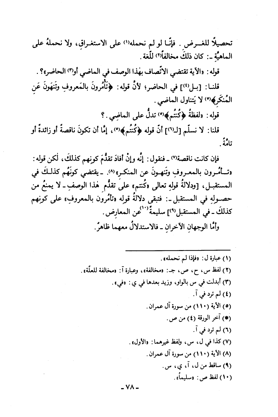 قلنا لا نسلم ل أن قوله كنتم إما أن تكون ناقصة أو زائدة أو تامة فإن كنت ناقصة فنقول إنه وان أفاد تقدم كونهم كذلك لكن قوله تأمرون بالمعروف وتنهون عن المنكر يقتضي كونهم كذلك في المستقبل ودلالة قوله تعالى كنتم على تقدم هذا الوصف لا يمنع من حصوله في المستقبل فتبقى دلالة قوله تأمرون بالمعروف على كونهم كذلك في المستقبل سليمة عن المعارض وأما الوجهان الآخران فالاستدلال معهما ظاهر