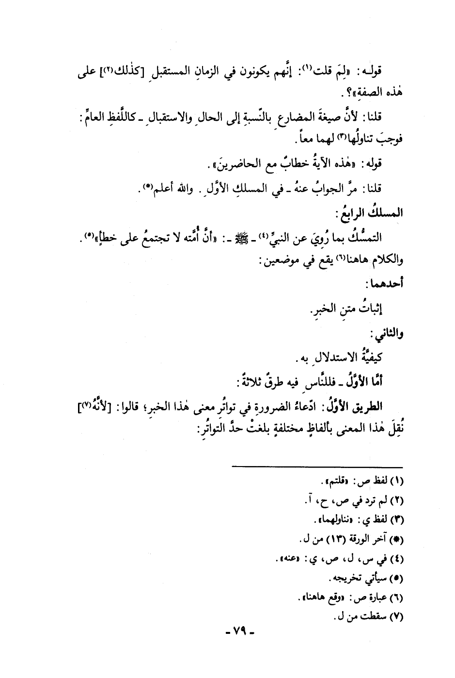 قوله لم قلت إنهم يكونون في الزمان المستقبل كذلك على هذه الصفة قلنا لأن صيغة المضارع بالنسبة إلى الحال والاستقبال كاللفظ العام فوجب تناولها لهما معا قوله هذه الآية خطاب مع الحاضرين قلنا مر الجواب عنه في المسلك الأول والله أعلم المسلك الرابع التمسك بما روي عن النبي صلى الله عليه وسلم أن أمته لا تجتمع على خطأ والكلام ها هنا يقع في موضعين أحدهما إثبات متن الخبر والثاني كيفية الاستدلال به أما الأول فللناس فيه طرق ثلاثة