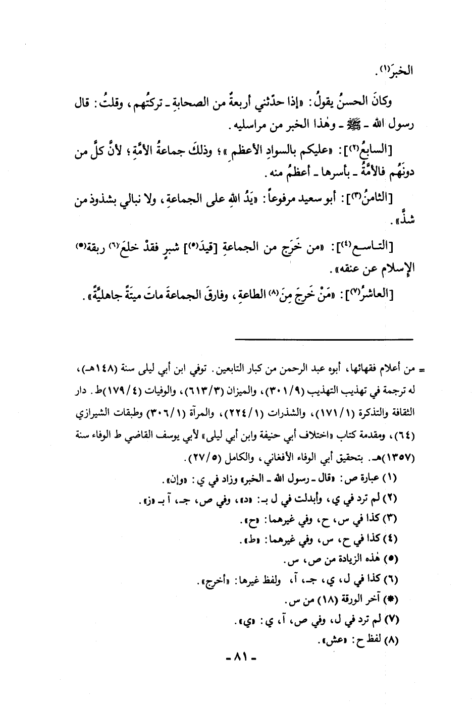 الخبر وكان الحسن يقول إذا حدثني أربعة من الصحابة تركتهم وقلت قال رسول الله صلى الله عليه وسلم وهذا الخبر من مراسليه السابع عليكم بالسواد الأعظم وذلك جماعة الأمة لأن كل من دونهم فالأمة بأسرها أعظم منه الثامن أبو سعيد مرفوعا يد الله على الجماعة ولا نبالي بشذوذ من شذ التاسع من خرج من الجماعة قيد شبر فقد خلع ربقة الاسلام عن عنقه