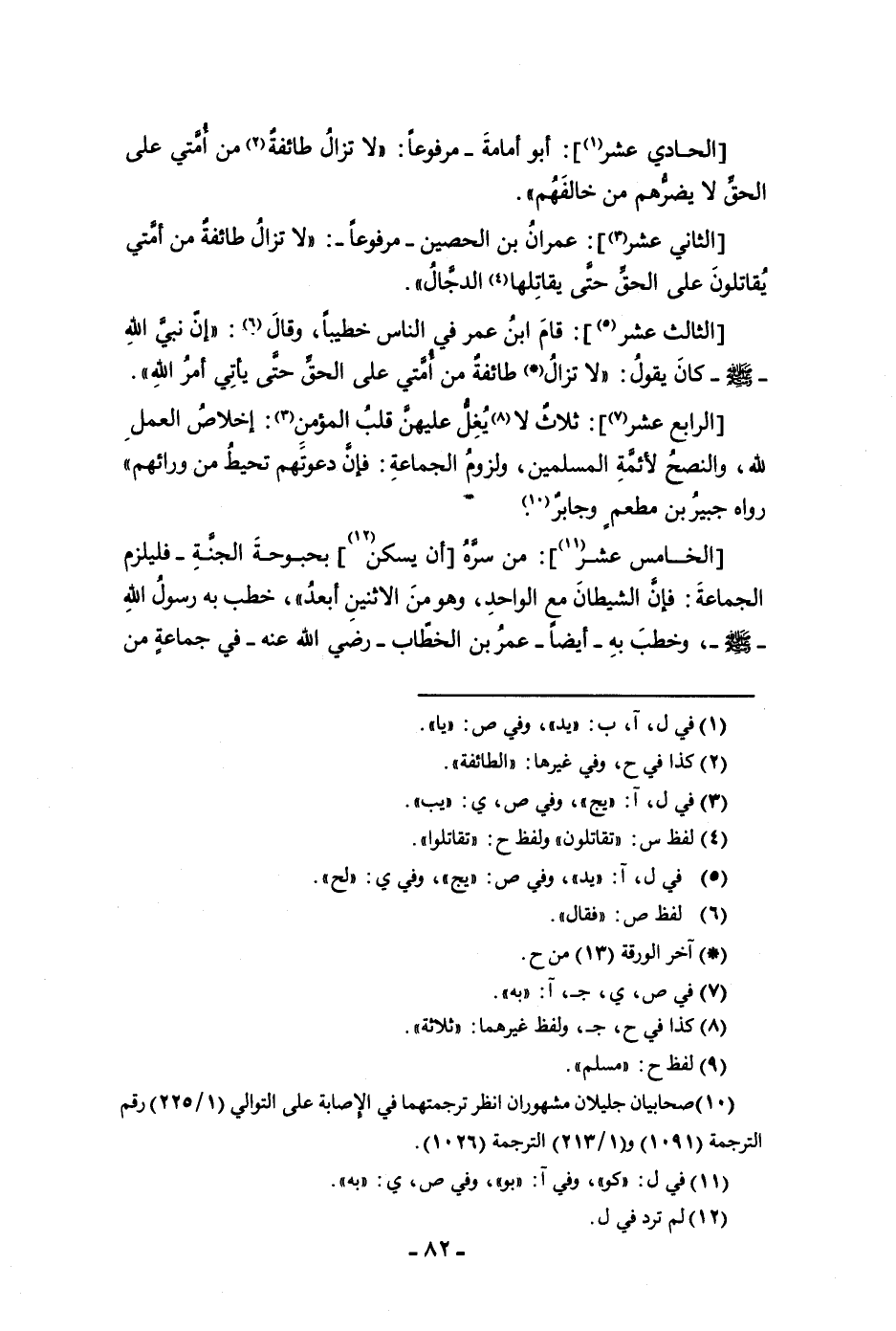الحادي عشر أبو أمامة مرفوعا لا تزال طائفة من أمتي على الحق لا يضرهم من خالفهم الثاني عشر عمران بن الحصين مرفوعا لا تزال طائفة من أمتي يقاتلون على الحق حتى يقاتلها الدجال الثالث عشر قام ابن عمر في الناس خطيبا وقال إن نبي الله صلى الله عليه وسلم كان يقول لا تزال طائفة من أمتي على الحق حتى يأتي أمر الله الرابع عشر ثلاث لا يغل عليهن قلب المؤمن إخلاص العمل لله والنصح لأئمة المسلمين ولزوم الجماعة فإن دعوتهم تحيط من ورائهم رواه جبير بن مطعم وجابر الخامس عشر من سره أن يسكن بحبوحه الله الجنة فليلزم الجماعة فإن الشيطان مع الواحد وهو من الاثنين أبعد خطب به رسول الله صلى الله عليه وسلم وخطب به أيضا عمر بن الخطاب رضي الله عنه في جماعة من