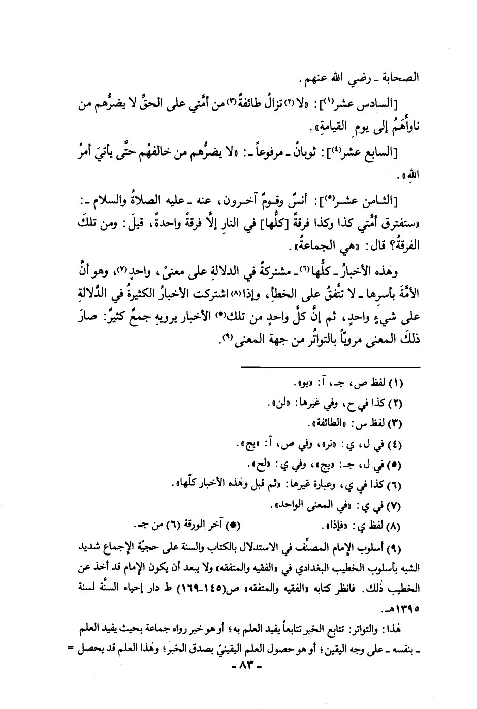 الصحابة رضي الله عنهم السادس عشر لا تزال طائفة من أمتي على الحق لا يضرهم من ناوأهم إلى يوم القيامة السابع عشر ثوبان مرفوعا لا يضرهم من خالفهم حتى يأتي أمر الله الثامن عشر أنس وقوم آخرون عنه عليه الصلاة والسلام ستفترق أمتي كذا وكذا فرقة كلها في النار إلا فرقة واحدة قيل ومن تلك