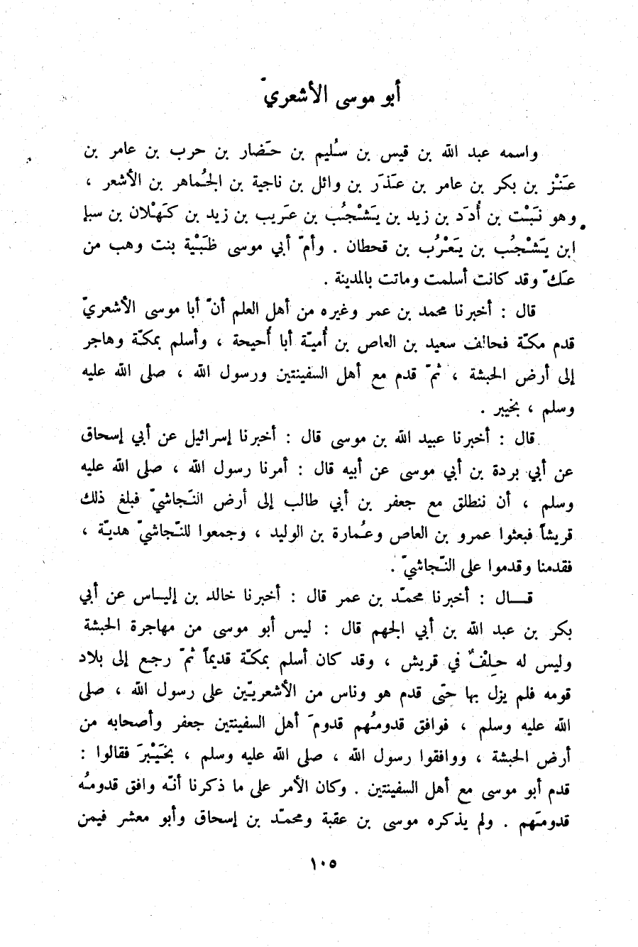 قَالَ: أَخْبَرَنَا مُحَمَّدُ بْنُ عَمْرٍو، وَغَيْرُهُ مِنْ أَهْلِ الْعِلْمِ أَنَّ §أَبَا مُوسَى الْأَشْعَرِيَّ قَدِمَ مَكَّةَ، فَحَالَفَ سَعِيدَ بْنَ الْعَاصِ بْنِ أُمَيَّةَ أَبَا أُحَيْحَةَ، وَأَسْلَمَ بِمَكَّةَ، وَهَاجَرَ إِلَى أَرْضِ الْحَبَشَةِ، ثُمَّ قَدِمَ مَعَ أَهْلِ السَّفِينَتَيْنِ، وَرَسُولُ اللَّهِ صلّى الله عليه وسلم بِخَيْبَرَ