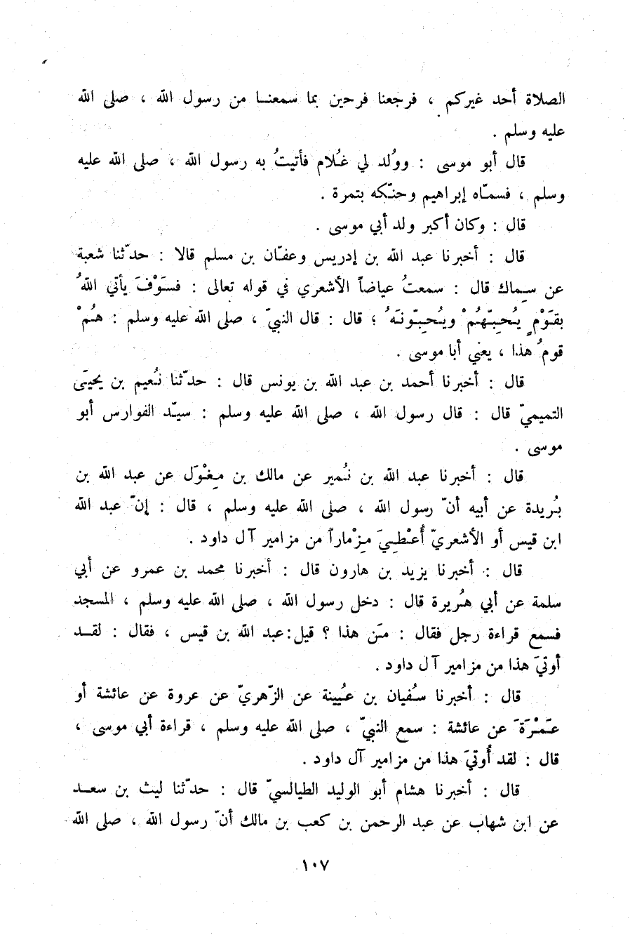 قَالَ: أَخْبَرَنَا هِشَامُ أَبُو الْوَلِيدِ الطَّيَالِسِيُّ، قَالَ: حَدَّثَنَا لَيْثُ بْنُ سَعْدٍ، عَنِ ابْنِ شِهَابٍ، عَنْ عَبْدِ الرَّحْمَنِ بْنِ كَعْبِ بْنِ مَالِكٍ أَنَّ رَسُولَ اللَّهِ صلّى الله -[108]- عليه وسلم سَمِعَ أَبَا مُوسَى يَقْرَأُ فَقَالَ: «لَقَدْ §أُوتِيَ أَخُوكُمْ مِنْ مَزَامِيرِ آلِ دَاوُدَ»