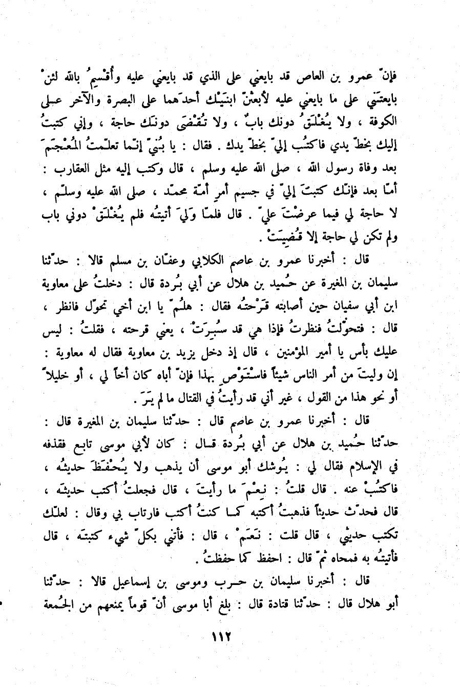فَإِنَّ عَمْرَو بْنَ الْعَاصِ قَدْ بَايَعَنِي عَلَى الَّذِي قَدْ بَايَعَنِي عَلَيْهِ، وَأُقْسِمُ بِاللَّهِ: لَئِنْ بَايَعْتَنِي عَلَى مَا بَايَعَنِي عَلَيْهِ لَأَبْعَثَنَّ ابْنَيْكَ أَحَدَهُمَا عَلَى الْبَصْرَةِ وَالْآخَرُ عَلَى الْكُوفَةِ، وَلَا يُغْلَقُ دُونَكَ بَابٌ، وَلَا تُقْضَى دُونَكَ حَاجَةٌ، وَإِنِّي كُتَبْتَ إِلَيْكَ بِخَطِّ يَدِي، فَاكْتُبْ إِلَيَّ بِخَطِّ يَدِكَ، فَقَالَ: يَا بُنَيَّ إِنَّمَا تَعَلَّمْتُ الْمُعْجَمَ بَعْدَ وَفَاةِ رَسُولِ اللَّهِ صلّى الله عليه وسلم، قَالَ: وَكَتَبَ إِلَيْهِ مِثْلَ الْعَقَارِبِ: أَمَّا بَعْدُ فَإِنَّكَ كَتَبْتَ إِلَيَّ فِي جَسِيمِ أَمْرِ أُمَّةِ مُحَمَّدٍ صلّى الله عليه وسلم، لَا حَاجَةَ لِي فِيمَا عَرَضَّتَ عَلَيَّ، قَالَ: فَلَمَّا وَلِيَ أَتَيْتُهُ، فَلَمْ يُغْلَقْ دُونِي بَابٌ، وَلَمْ تَكُنْ لِي حَاجَةٌ إِلَّا قُضِيَتْ