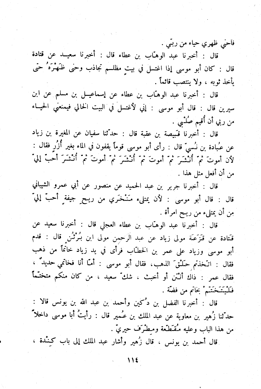 قَالَ: أَخْبَرَنَا عَبْدُ الْوَهَّابِ بْنُ عَطَاءٍ، عَنْ إِسْمَاعِيلَ بْنِ مُسْلِمٍ، عَنِ ابْنِ سِيرِينَ، قَالَ: قَالَ أَبُو مُوسَى: إِنِّي §لَأَغْتَسِلُ فِي الْبَيْتِ الْخَالِي، فَيَمْنَعُنِي الْحَيَاءُ مِنْ رَبِّي أَنْ أُقِيمَ صُلْبِي