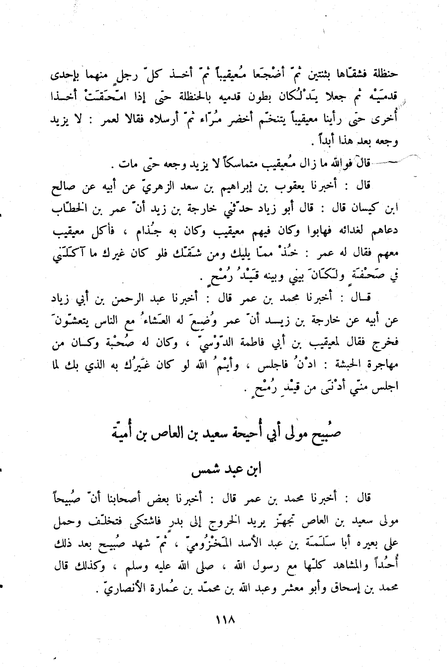 قَالَ: أَخْبَرَنَا مُحَمَّدُ بْنُ عُمَرَ، قَالَ: أَخْبَرَنَا بَعْضُ أَصْحَابِنَا أَنَّ §صُبَيْحًا، مَوْلَى سَعِيدِ بْنِ الْعَاصِ تَجَهَّزَ يُرِيدُ الْخُرُوجَ إِلَى بَدْرٍ، فَاشْتَكَى، فَتَخَلَّفَ وَحَمَلَ عَلَى بَعِيرِهِ أَبَا سَلَمَةَ بْنَ عَبْدِ الْأَسَدِ الْمَخْزُومِيَّ، ثُمَّ شَهِدَ صُبَيْحٌ بَعْدَ ذَلِكَ أُحُدًا وَالْمَشَاهِدَ كُلَّهَا مَعَ رَسُولِ اللَّهِ صلّى الله عليه وسلم وَكَذَلِكَ قَالَ مُحَمَّدُ بْنُ إِسْحَاقَ، وَأَبُو مَعْشَرٍ، وَعَبْدُ اللَّهِ بْنُ مُحَمَّدِ بْنِ عُمَارَةَ الْأَنْصَارِيُّ