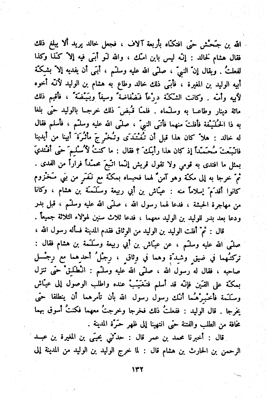اللَّهِ بْنُ جَحْشٍ حَتَّى افْتَكَّاهُ بِأَرْبَعَةِ آلَافٍ، فَجَعَلَ خَالِدٌ يُرِيدُ أَلَّا يَبْلُغَ ذَلِكَ، فَقَالَ هِشَامٌ لِخَالِدٍ: إِنَّهُ لَيْسَ بِابْنِ أُمِّكَ وَاللَّهِ لَوْ أَبَى فِيهِ إِلَّا كَذَا وَكَذَا لَفَعَلْتُ وَيُقَالُ: إِنَّ النَّبِيَّ صلّى الله عليه وسلم أَبَى أَنْ يَفْدِيَهُ إِلَّا بِشِكَّةِ أَبِيهِ الْوَلِيدِ بْنِ الْمُغِيرَةِ، فَأَبَى ذَلِكَ خَالِدٌ وَطَاعَ بِهِ هِشَامَ بْنَ الْوَلِيدِ، لِأَنَّهُ أَخُوهُ لِأَبِيهِ وَأُمِّهِ، وَكَانَتِ الشِّكَّةُ دِرْعًا فَضَفَاضَةً وَسَيْفًا وَبَيْضَةً، فَأُقِيمَ ذَلِكَ مِائَةَ دِينَارٍ وَطَاعَا بِهِ وَسَلَّمَاهُ، فَلَمَّا قُبِضَ ذَلِكَ خَرَجَا بِالْوَلِيدِ حَتَّى بَلَغَا بِهِ ذَا الْحُلَيْفَةِ، فَأَفْلَتَ مِنْهُمَا، فَأَتَى النَّبِيَّ صلّى الله عليه وسلم، فَأَسْلَمَ، فَقَالَ لَهُ خَالِدٌ: هَلَّا كَانَ هَذَا قَبْلَ أَنْ تَفْتَدِيَ وَتُخْرِجَ مَأْثُرَةَ أَبِينَا مِنْ أَيْدِينَا، فَاتَّبَعْتَ مُحَمَّدًا إِذْ كَانَ هَذَا رَأْيَكَ؟ فَقَالَ: مَا كُنْتُ لِأُسْلِمَ حَتَّى أَفْتَدِيَ بِمِثْلِ مَا افْتَدَى بِهِ قَوْمِي، وَلَا تَقُولُ قُرَيْشٌ: إِنَّمَا اتَّبَعَ مُحَمَّدًا فِرَارًا مِنَ الْفِدَى، ثُمَّ خَرَجَا بِهِ إِلَى مَكَّةَ، وَهُوَ آمِنٌ لَهُمَا، فَحَبَسَاهُ بِمَكَّةَ مَعَ نَفَرٍ مِنْ بَنِي مَخْزُومٍ، كَانُوا أَقْدَمَ إِسْلَامًا مِنْهُ عَيَّاشِ بْنِ أَبِي رَبِيعَةَ، وَسَلَمَةَ بْنِ هِشَامٍ، وَكَانَا مِنْ مُهَاجِرَةِ الْحَبَشَةِ، فَدَعَا لَهُمَا رَسُولُ اللَّهِ صلّى الله عليه وسلم قَبْلَ بَدْرٍ، وَدَعَا بَعْدَ بَدْرٍ لِلْوَلِيدِ بْنِ الْوَلِيدِ مَعَهُمَا، فَدَعَا ثَلَاثَ سِنِينَ لِهَؤُلَاءِ الثَّلَاثَةِ جَمِيعًا، قَالَ: ثُمَّ أَفْلَتَ الْوَلِيدُ بْنُ الْوَلِيدِ مِنَ الْوَثَاقِ، فَقَدِمَ الْمَدِينَةَ، فَسَأَلَهُ رَسُولُ اللَّهِ صلّى الله عليه وسلم عَنْ عَيَّاشِ بْنِ أَبِي رَبِيعَةَ، وَسَلَمَةَ بْنِ هِشَامٍ، فَقَالَ: تَرَكْتُهُمَا فِي ضِيقٍ وَشِدَّةٍ وَهُمَا فِي وَثَاقِ رَجُلٍ أَحَدُهُمَا مَعَ رِجْلِ صَاحِبِهِ، فَقَالَ لَهُ رَسُولُ اللَّهِ صلّى الله عليه وسلم: «§انْطَلِقْ حَتَّى تَنْزِلَ بِمَكَّةَ عَلَى الْقَيْنِ، فَإِنَّهُ قَدْ أَسْلَمَ، فَتَغَيَّبْ عِنْدَهُ، وَاطْلُبِ الْوُصُولَ إِلَى عَيَّاشٍ، وَسَلَمَةَ، فَأَخْبِرْهُمَا أَنَّكَ رَسُولُ رَسُولِ اللَّهِ بِأَنْ تَأْمُرَهُمَا أَنْ يَنْطَلِقَا حَتَّى يَخْرُجَا» . قَالَ الْوَلِيدُ: فَفَعَلْتُ ذَلِكَ، فَخَرَجَا وَخَرَجْتُ مَعَهُمَا، فَكُنْتُ أَسُوقُ بِهِمَا مَخَافَةً مِنَ الطَّلَبِ وَالْفِتْنَةِ حَتَّى انْتَهَيْنَا إِلَى ظَهْرِ حَرَّةِ الْمَدِينَةِ