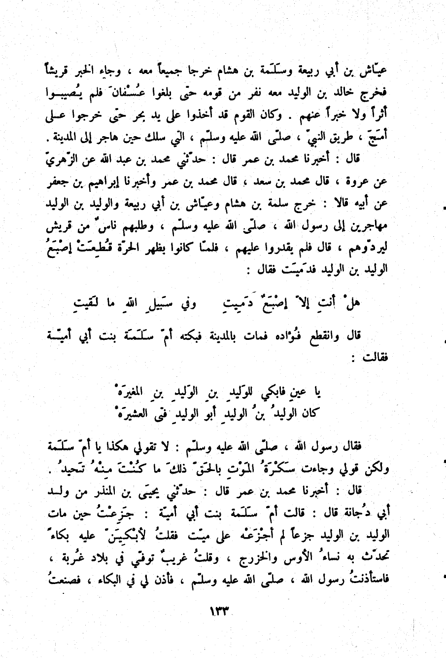 قَالَ: أَخْبَرَنَا مُحَمَّدُ بْنُ عُمَرَ، قَالَ: حَدَّثَنِي مُحَمَّدُ بْنُ عَبْدِ اللَّهِ، عَنِ الزُّهْرِيِّ، عَنْ عُرْوَةَ - قَالَ مُحَمَّدُ بْنُ سَعْدٍ: قَالَ مُحَمَّدُ بْنُ عُمَرَ - , وَأَخْبَرَنَا إِبْرَاهِيمُ بْنُ جَعْفَرٍ، عَنْ أَبِيهِ، قَالَا: خَرَجَ سَلَمَةُ بْنُ هِشَامٍ , وَعَيَّاشُ بْنُ أَبِي رَبِيعَةَ , وَالْوَلِيدُ بْنُ الْوَلِيدِ مُهَاجِرِينَ إِلَى رَسُولِ اللَّهِ صلّى الله عليه وسلم، وَطَلَبَهُمْ نَاسٌ مِنْ قُرَيْشٍ لِيَرُدُّوهُمْ قَالَ: فَلَمْ يَقْدِرُوا عَلَيْهِمْ , فَلَمَّا كَانُوا بِظَهْرِ الْحَرَّةِ قُطِعَتْ إِصْبَعُ الْوَلِيدِ بْنِ الْوَلِيدِ , فَدَمِيَتْ , فَقَالَ: