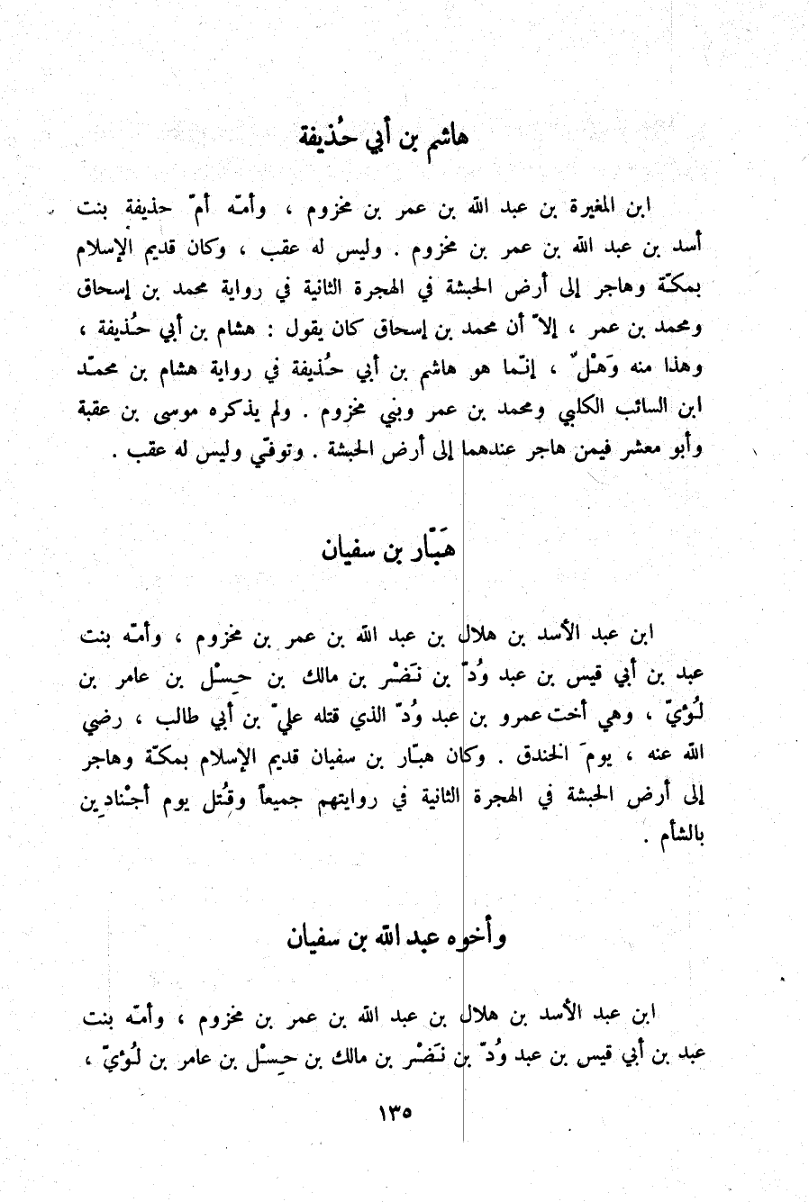 §هَاشِمُ بْنُ أَبِي حُذَيْفَةَ بْنِ الْمُغِيرَةِ بْنِ عَبْدِ اللَّهِ بْنِ عُمَرَ بْنِ مَخْزُومٍ وَأُمُّهُ أُمُّ حُذَيْفَةَ بِنْتُ أَسَدِ بْنِ عَبْدِ اللَّهِ بْنِ عُمَرَ بْنِ مَخْزُومٍ. وَلَيْسَ لَهُ عَقِبٌ، وَكَانَ قَدِيمَ الْإِسْلَامِ بِمَكَّةَ , وَهَاجَرَ إِلَى أَرْضِ الْحَبَشَةِ فِي الْهِجْرَةِ الثَّانِيَةِ، فِي رِوَايَةِ مُحَمَّدِ بْنِ إِسْحَاقَ , وَمُحَمَّدِ بْنِ عُمَرَ إِلَّا أَنَّ مُحَمَّدَ بْنَ إِسْحَاقَ كَانَ يَقُولُ: هِشَامُ بْنُ أَبِي حُذَيْفَةَ وَهَذَا مِنْهُ وَهْلٌ إِنَّمَا هُوَ هَاشِمُ بْنُ أَبِي حُذَيْفَةَ فِي رِوَايَةِ هِشَامِ بْنِ مُحَمَّدِ بْنِ السَّائِبِ الْكَلْبِيِّ , وَمُحَمَّدِ بْنِ عُمَرَ , وَبَنِي مَخْزُومٍ، وَلَمْ يَذْكُرْهُ مُوسَى بْنُ عُقْبَةَ , وَأَبُو مَعْشَرٍ فِيمَنْ هَاجَرَ عِنْدَهُمَا إِلَى أَرْضِ الْحَبَشَةِ، وَتُوُفِّيَ وَلَيْسَ لَهُ عَقِبٌ