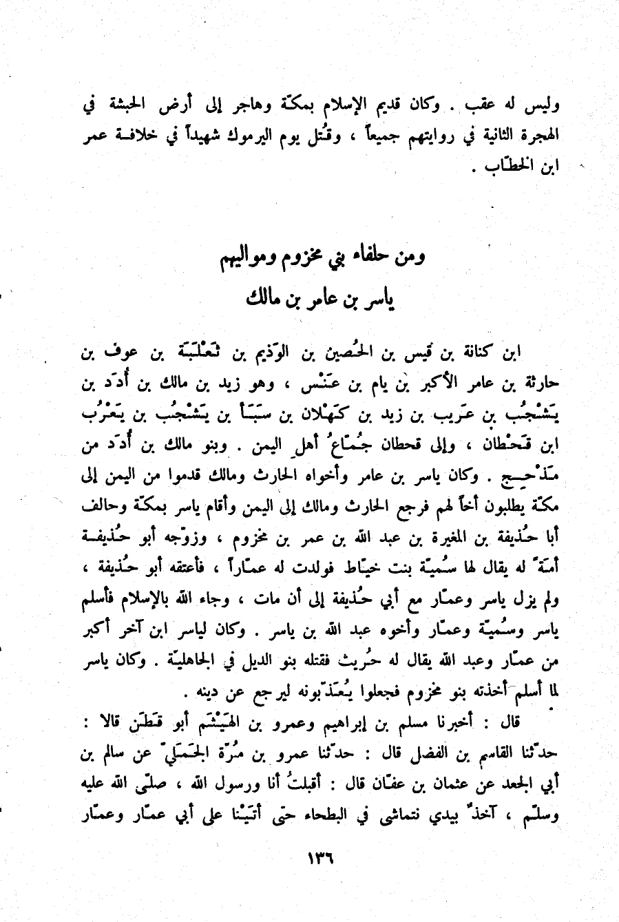 §يَاسِرُ بْنُ عَامِرِ بْنِ مَالِكِ بْنِ كِنَانَةَ بْنِ قَيْسِ بْنِ الْحُصَيْنِ بْنِ الْوَذِيمِ بْنِ ثَعْلَبَةَ بْنِ عَوْفِ بْنِ حَارِثَةَ بْنِ عَامِرٍ الْأَكْبَرِ بْنِ يَامِ بْنِ عَنْسٍ وَهُوَ زَيْدُ بْنُ مَالِكِ بْنِ آدَدَ بْنِ يَشْجُبَ بْنِ عُرَيْبِ بْنِ زَيْدِ بْنِ كَهْلَانَ بْنِ سَبَأِ بْنِ يَشْجُبَ بْنِ يُعْرِبَ بْنِ قَحْطَانَ وَإِلَى قَحْطَانَ جُمَّاعُ أَهْلِ الْيَمَنِ , وَبَنُو مَالِكِ بْنِ آدَدَ مِنْ مُذْحِجٍ، وَكَانَ يَاسِرُ بْنُ عَامِرٍ وَأَخَوَاهُ الْحَارِثُ , وَمَالِكٌ قَدِمُوا مِنَ الْيَمَنِ إِلَى مَكَّةَ يَطْلُبُونَ أَخًا لَهُمْ , فَرَجَعَ الْحَارِثُ , وَمَالِكٌ إِلَى الْيَمَنِ , وَأَقَامَ يَاسِرٌ بِمَكَّةَ , وَحَالَفَ أَبَا حُذَيْفَةَ بْنَ الْمُغِيرَةِ بْنِ عَبْدِ اللَّهِ بْنِ عُمَرَ بْنِ مَخْزُومٍ. وَزَوَّجَهُ أَبُو حُذَيْفَةَ أَمَةً لَهُ , يُقَالُ لَهَا: سُمَيَّةُ بِنْتُ خَيَّاطٍ , فَوَلَدَتْ لَهُ عَمَّارًا , فَأَعْتَقَهُ أَبُو حُذَيْفَةَ , وَلَمْ يَزَلْ يَاسِرٌ , وَعَمَّارٌ مَعَ أَبِي حُذَيْفَةَ إِلَى أَنْ مَاتَ , وَجَاءَ اللَّهُ بِالْإِسْلَامِ , فَأَسْلَمَ يَاسِرٌ , وَسُمَيَّةُ , وَعَمَّارٌ , وَأَخَوَاهُ عَبْدُ اللَّهِ بْنُ يَاسِرٍ، وَكَانَ لِيَاسِرٍ ابْنٌ آخَرُ أَكْبَرُ مِنْ عَمَّارٍ، وَعَبْدُ اللَّهِ يُقَالُ لَهُ: حُرَيْثٌ، فَقَتَلَهُ بَنُو الدِّيلِ فِي الْجَاهِلِيَّةِ، وَكَانَ يَاسِرٌ لَمَّا أَسْلَمَ أَخَذَتْهُ بَنُو مَخْزُومٍ , فَجَعَلُوا يُعَذِّبُونَهُ لِيَرْجِعَ عَنْ دِينِهِ