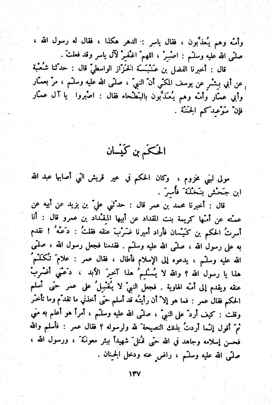 قَالَ: أَخْبَرَنَا مُحَمَّدُ بْنُ عُمَرَ، قَالَ: حَدَّثَنِي عَلِيُّ بْنُ يَزِيدَ، عَنْ أَبِيهِ، عَنْ عَمَّتِهِ، عَنْ أُمِّهَا كَرِيمَةَ بِنْتِ الْمِقْدَادِ، عَنْ أَبِيهَا الْمِقْدَادِ بْنِ عَمْرٍو، قَالَ: أَنَا أَسَرْتُ الْحَكَمَ بْنَ كَيْسَانَ، فَأَرَادَ أَمِيرُنَا ضَرْبَ عُنُقِهِ , فَقُلْتُ: دَعْهُ نَقْدُمُ بِهِ عَلَى رَسُولِ اللَّهِ صلّى الله عليه وسلم , فَقَدِمْنَا , فَجَعَلَ رَسُولُ اللَّهِ صلّى الله عليه وسلم يَدْعُوهُ إِلَى الْإِسْلَامِ , فَأَطَالَ , فَقَالَ عُمَرُ: عَلَامَ تُكَلِّمُ هَذَا يَا رَسُولَ اللَّهِ؟ وَاللَّهِ لَا يُسْلِمُ هَذَا آخِرَ الْأَبَدِ، دَعْنِي أَضْرِبْ عُنُقَهُ وَيُقْدِمُ إِلَى أُمِّهِ الْهَاوِيَةِ , فَجَعَلَ النَّبِيُّ لَا يُقْبِلُ عَلَى عُمَرَ حَتَّى أَسْلَمَ الْحَكَمُ، فَقَالَ عُمَرُ: فَمَا هُوَ إِلَّا أَنْ رَأَيْتُهُ قَدْ §أَسْلَمَ حَتَّى أَخَذَنِي مَا تَقَدَّمَ وَمَا تَأَخَّرَ، وَقُلْتُ: كَيْفَ أَرُدُّ عَلَى النَّبِيِّ صلّى الله عليه وسلم أَمْرًا هُوَ أَعْلَمُ بِهِ مِنِّي، ثُمَّ أَقُولُ: إِنَّمَا أَرَدْتُ بِذَلِكَ النَّصِيحَةَ لِلَّهِ وَلِرَسُولِهِ , فَقَالَ عُمَرُ: فَأَسْلَمَ وَاللَّهِ , فَحَسُنَ إِسْلَامُهُ , وَجَاهَدَ فِي اللَّهِ حَتَّى قُتِلَ شَهِيدًا بِبِئْرِ مَعُونَةَ وَرَسُولُ اللَّهِ صلّى الله عليه وسلم رَاضٍ عَنْهُ , وَدَخَلَ الْجِنَّانَ