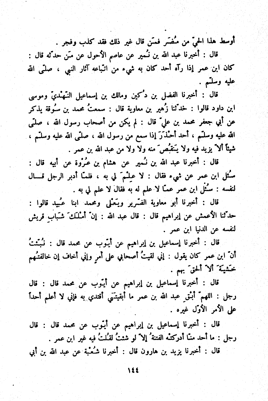 قَالَ: أَخْبَرَنَا الْفَضْلُ بْنُ دُكَيْنٍ، وَمَالِكُ بْنُ إِسْمَاعِيلَ النَّهْدِيُّ، وَمُوسَى بْنُ دَاوُدَ، قَالُوا: حَدَّثَنَا زُهَيْرُ بْنُ مُعَاوِيَةَ، قَالَ: سَمِعْتُ مُحَمَّدَ بْنَ سُوقَةَ , يَذْكُرُ عَنْ أَبِي جَعْفَرٍ مُحَمَّدِ بْنِ عَلِيٍّ قَالَ: لَمْ يَكُنْ مِنْ أَصْحَابِ رَسُولِ اللَّهِ صلّى الله عليه وسلم أَحَدٌ §أَحْذَرَ إِذَا سَمِعَ مِنَ رَسُولِ اللَّهِ صلّى الله عليه وسلم شَيْئًا أَلَّا يَزِيدُ فِيهِ وَلَا يَنْقُصُ مِنْهُ وَلَا وَلَا مِنْ عَبْدِ اللَّهِ بْنِ عُمَرَ