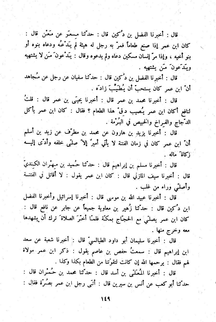 قَالَ: أَخْبَرَنَا الْفَضْلُ بْنُ دُكَيْنٍ، قَالَ: حَدَّثَنَا سُفْيَانُ، عَنْ رَجُلٍ، عَنْ مُجَاهِدٍ، أَنَّ §ابْنَ عُمَرَ كَانَ يَسْتَحِبُّ أَنْ يُطَيِّبَ زَادَهُ