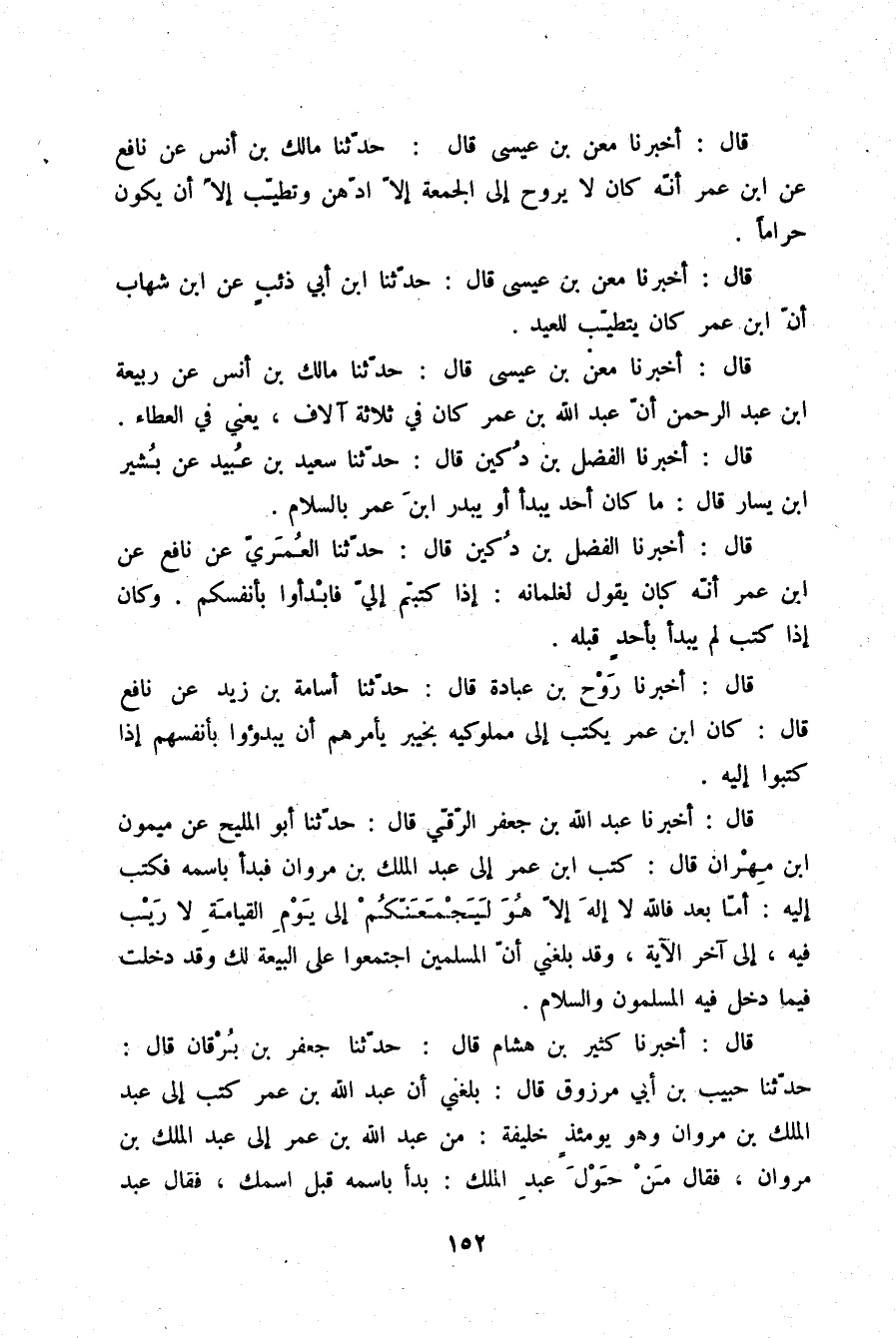قَالَ: أَخْبَرَنَا الْفَضْلُ بْنُ دُكَيْنٍ، قَالَ: حَدَّثَنَا الْعُمَرِيُّ، عَنْ نَافِعٍ، عَنِ ابْنِ عُمَرَ أَنَّهُ كَانَ يَقُولُ لِغِلْمَانِهِ: إِذَا §كَتَبْتُمْ إِلَيَّ فَابْدَءُوا بِأَنْفُسِكُمْ. وَكَانَ إِذَا كَتَبَ لَمْ يَبْدَأْ بِأَحَدٍ قَبْلَهُ