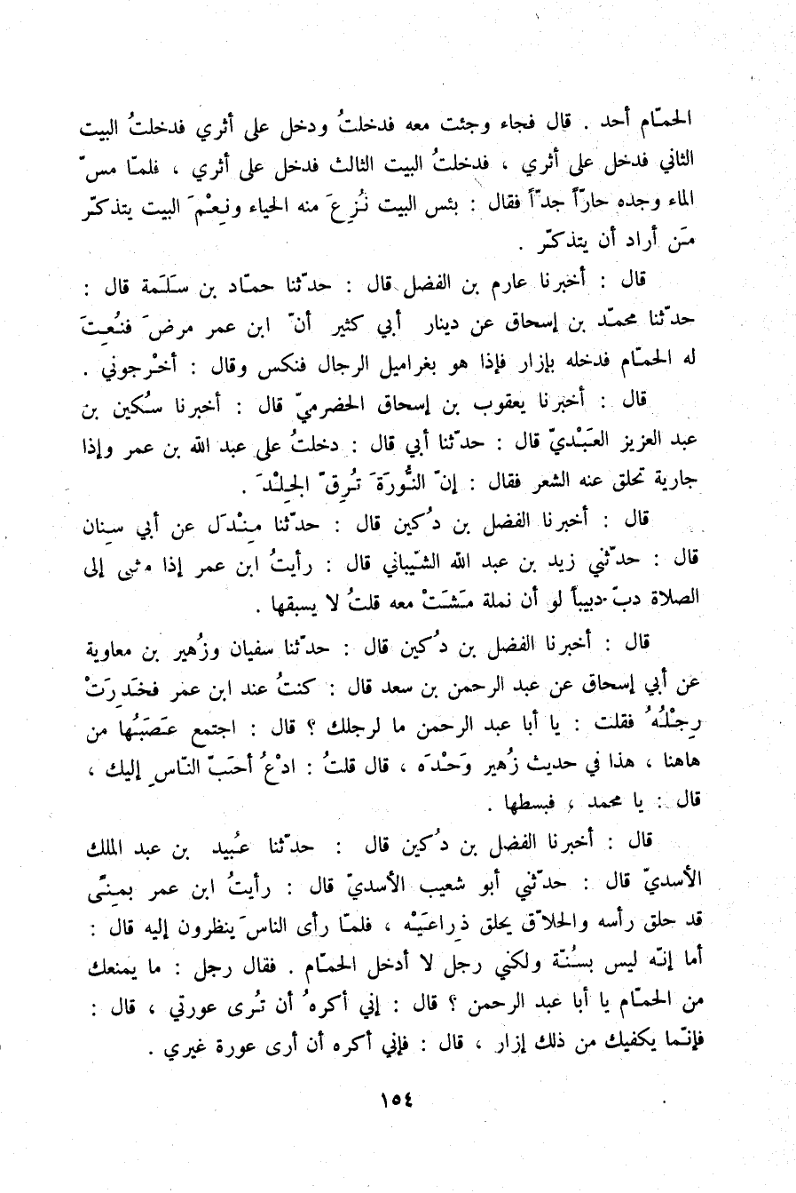 قَالَ: أَخْبَرَنَا الْفَضْلُ بْنُ دُكَيْنٍ، قَالَ: حَدَّثَنَا عُبَيْدُ بْنُ عَبْدِ الْمَلِكِ الْأَسَدِيُّ، قَالَ: حَدَّثَنِي أَبُو شُعَيْبٍ الْأَسَدِيُّ، قَالَ: رَأَيْتُ §ابْنَ عُمَرَ بِمِنًى قَدْ حَلَقَ رَأْسَهُ، وَالْحَلَّاقُ يَحْلِقُ ذِرَاعَيْهِ , فَلَمَّا رَأَى النَّاسَ يَنْظُرُونَ إِلَيْهِ قَالَ: أَمَا إِنَّهُ لَيْسَ بِسُنَّةٍ، وَلَكِنِّي رَجُلٌ لَا أَدْخَلُ الْحَمَّامَ , فَقَالَ رَجُلٌ: مَا يَمْنَعُكَ مِنَ الْحَمَّامِ يَا أَبَا عَبْدِ الرَّحْمَنِ؟ قَالَ: إِنِّي أَكْرَهُ أَنْ تُرَى عَوْرَتِي، قَالَ: فَإِنَّمَا يَكْفِيكَ مِنْ ذَلِكَ إِزَارٌ، قَالَ: فَإِنِّي أَكْرَهُ أَنْ أَرَى عَوْرَةَ غَيْرِي