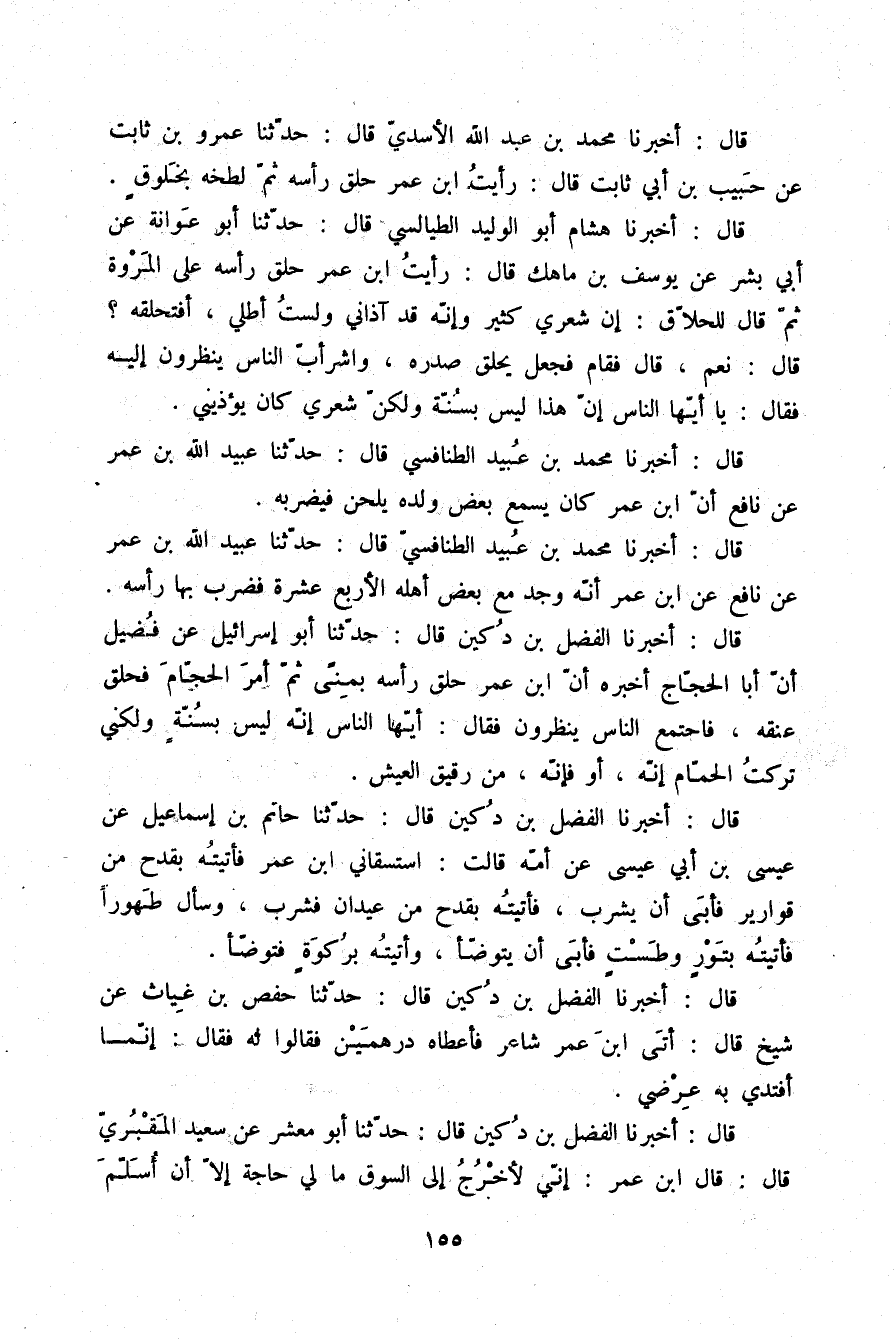قَالَ: أَخْبَرَنَا الْفَضْلُ بْنُ دُكَيْنٍ، قَالَ: حَدَّثَنَا أَبُو إِسْرَائِيلَ، عَنْ فُضَيْلٍ، أَنَّ أَبَا الْحَجَّاجِ أَخْبَرَهُ أَنَّ ابْنَ عُمَرَ حَلَقَ رَأْسَهُ بِمِنًى , ثُمَّ أَمَرَ الْحَجَّامَ فَحَلَقَ عُنُقَهُ، فَاجْتَمَعَ النَّاسُ يَنْظُرُونَ , فَقَالَ: أَيُّهَا النَّاسُ إِنَّهُ لَيْسَ بِسُنَّةٍ وَلَكِنِّي §تَرَكْتُ الْحَمَّامَ إِنَّهُ أَوْ فَإِنَّهُ مِنْ رَقِيقِ الْعَيْشِ