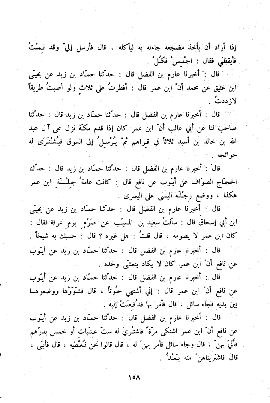قَالَ: أَخْبَرَنَا عَارِمُ بْنُ الْفَضْلِ، قَالَ: حَدَّثَنَا حَمَّادُ بْنُ زَيْدٍ، عَنْ أَيُّوبَ، عَنْ نَافِعٍ، أَنَّ §ابْنَ عُمَرَ، كَانَ لَا يَكَادُ يَتَعَشَّى وَحْدَهُ