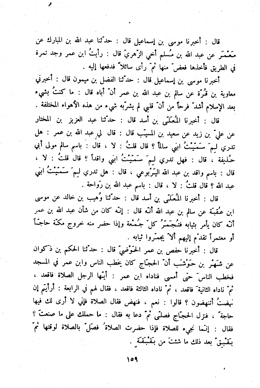 قَالَ: أَخْبَرَنَا مُوسَى بْنُ إِسْمَاعِيلَ، قَالَ: حَدَّثَنَا الْفَضْلُ بْنُ مَيْمُونٍ، قَالَ: أَخْبَرَنِي مُعَاوِيَةُ بْنُ قُرَّةَ، عَنْ سَالِمِ بْنِ عَبْدِ اللَّهِ بْنِ عُمَرَ، أَنَّ أَبَاهُ، قَالَ: مَا §كُنْتُ بِشَيْءٍ بَعْدَ الْإِسْلَامِ أَشَدُّ فَرَحًا مِنْ أَنَّ قَلْبِي لَمْ يُشَرِّبْهُ شَيْءٌ مِنْ هَذِهِ الْأَهْوَاءِ الْمُخْتَلِفَةِ