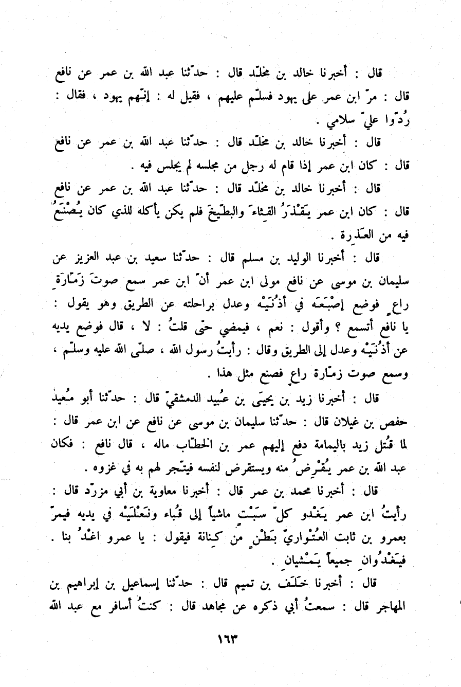 قَالَ: أَخْبَرَنَا الْوَلِيدُ بْنُ مُسْلِمٍ قَالَ: حَدَّثَنَا سَعِيدُ بْنُ عَبْدِ الْعَزِيزِ، عَنْ سُلَيْمَانَ بْنِ مُوسَى، عَنْ نَافِعٍ مَوْلَى ابْنِ عُمَرَ أَنَّ ابْنَ عُمَرَ سَمِعَ صَوْتَ زَمَّارَةِ رَاعٍ , فَوَضَعَ إِصْبَعَهُ فِي أُذُنَيْهِ , وَعَدَلَ بِرَاحِلَتِهِ عَنِ الطَّرِيقِ , وَهُوَ يَقُولُ: يَا نَافِعُ أَتَسْمَعُ؟ وَأَقُولُ: نَعَمْ، فَيَمْضِي حَتَّى قُلْتُ: لَا، قَالَ: فَوَضَعَ يَدَيْهِ عَنْ أُذُنَيْهِ , وَعَدَلَ إِلَى الطَّرِيقِ , وَقَالَ: §رَأَيْتُ رَسُولَ اللَّهِ صلّى الله عليه وسلم , وَسَمِعَ صَوْتَ زَمَّارَةِ رَاعٍ , فَصَنَعَ مِثْلَ هَذَا
