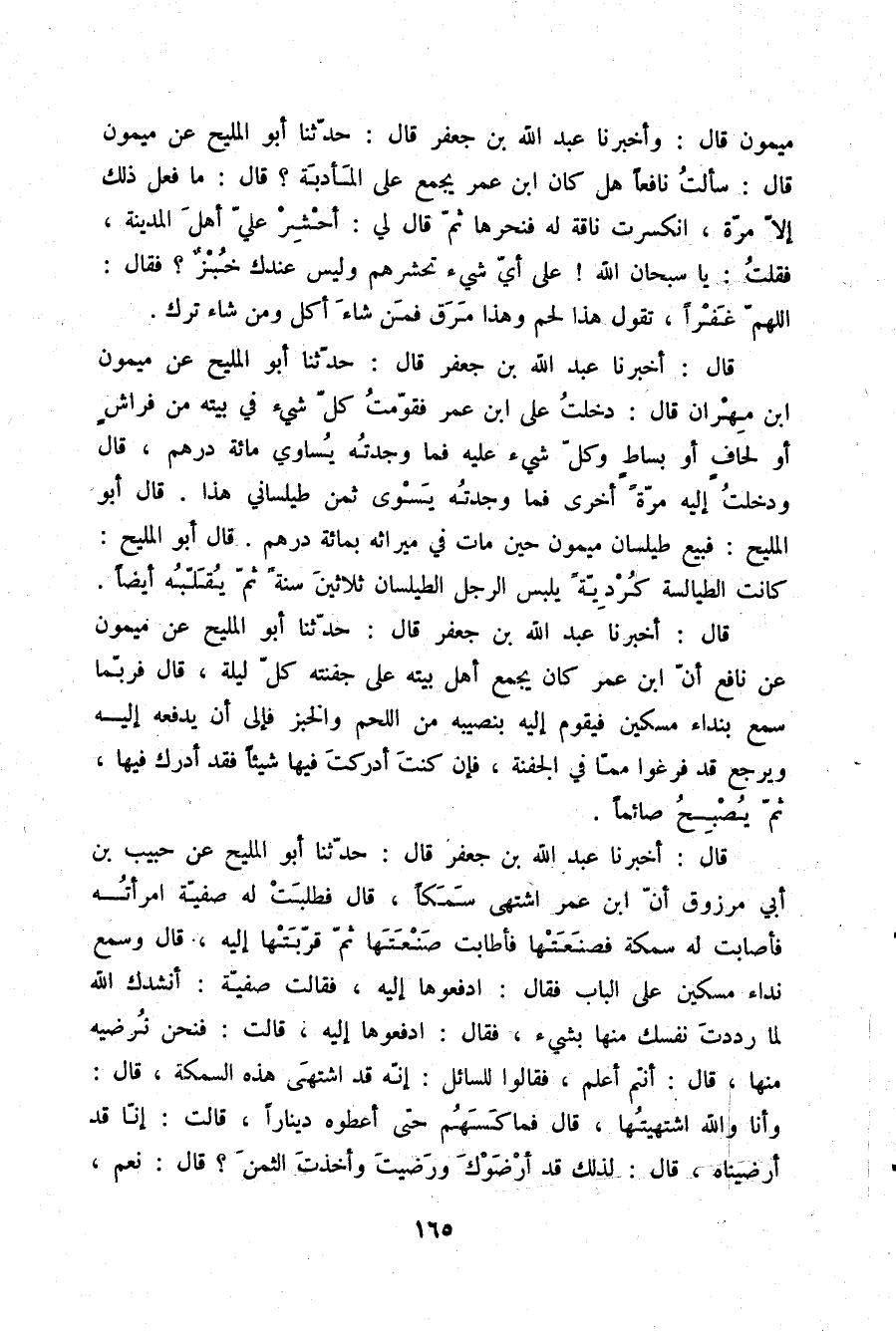 قَالَ: أَخْبَرَنَا عَبْدُ اللَّهِ بْنُ جَعْفَرٍ قَالَ: حَدَّثَنَا أَبُو الْمَلِيحِ، عَنْ حَبِيبِ بْنِ أَبِي مَرْزُوقٍ، أَنَّ ابْنَ عُمَرَ اشْتَهَى سَمَكًا قَالَ: فَطَلَبَتْ لَهُ صَفِيَّةُ امْرَأَتُهُ , فَأَصَابَتْ لَهُ سَمَكَةً , فَصَنَعَتْهَا , فَأَطَابَتْ صَنْعَتَهَا، ثُمَّ قَرَّبَتْهَا إِلَيْهِ , قَالَ: وَسَمِعَ نِدَاءَ مِسْكِينٍ عَلَى الْبَابِ , فَقَالَ: §ادْفَعُوهَا إِلَيْهِ، فَقَالَتْ صَفِيَّةُ: أَنْشُدُكَ اللَّهَ لَمَّا رَدَدْتَ نَفْسَكَ مِنْهَا بِشَيْءٍ، فَقَالَ: ادْفَعُوهَا إِلَيْهِ فَقَالَتْ: فَنَحْنُ نُرْضِيهِ مِنْهَا، قَالَ: أَنْتُمْ أَعْلَمُ , فَقَالُوا لِلسَّائِلِ: إِنَّهُ قَدِ اشْتَهَى هَذِهِ السَّمَكَةَ، قَالَ: وَأَنَا وَاللَّهِ اشْتَهَيْتُهَا، قَالَ: فَمَاكَسَهُمْ حَتَّى أَعْطُوهُ دِينَارًا , قَالَتْ: إِنَّا قَدْ أَرْضَيْنَاهُ، قَالَ: لِذَلِكَ قَدْ أَرْضَوكَ وَرَضِيتَ وَأَخَذْتَ الثَّمَنَ؟ قَالَ: نَعَمْ -[166]- قَالَ: ادْفَعُوهَا إِلَيْهِ