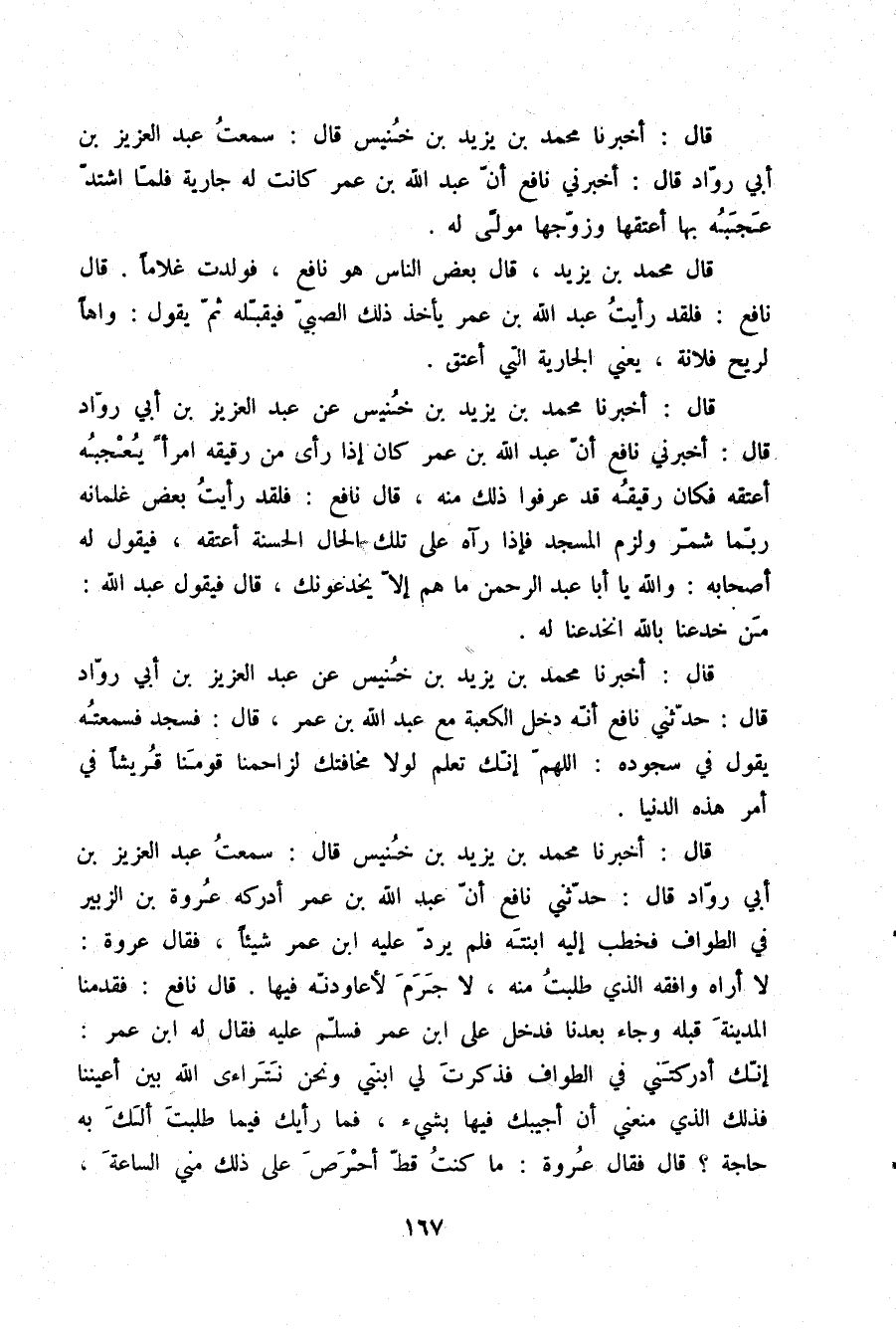 قَالَ: أَخْبَرَنَا مُحَمَّدُ بْنُ يَزِيدَ بْنِ خُنَيْسٍ قَالَ: سَمِعْتُ عَبْدَ الْعَزِيزِ بْنَ أَبِي رَوَّادٍ قَالَ: أَخْبَرَنِي نَافِعٌ أَنَّ §عَبْدَ اللَّهِ بْنَ عُمَرَ كَانَتْ لَهُ جَارِيَةٌ , فَلَمَّا اشْتَدَّ عُجْبُهُ بِهَا أَعْتَقَهَا , وَزَوَّجَهَا مَوْلًى لَهُ قَالَ مُحَمَّدُ بْنُ يَزِيدَ: قَالَ بَعْضُ النَّاسِ: هُوَ نَافِعٌ، فَوَلَدَتْ غُلَامًا , قَالَ نَافِعٌ: فَلَقَدْ رَأَيْتُ عَبْدَ اللَّهِ بْنَ عُمَرَ يَأْخُذُ ذَلِكَ الصَّبِيَّ فَيُقَبِّلُهُ، ثُمَّ يَقُولُ: وَاهًا لِرِيحِ فُلَانَةَ يَعْنِي الْجَارِيَةَ الَّتِي أَعْتَقَ