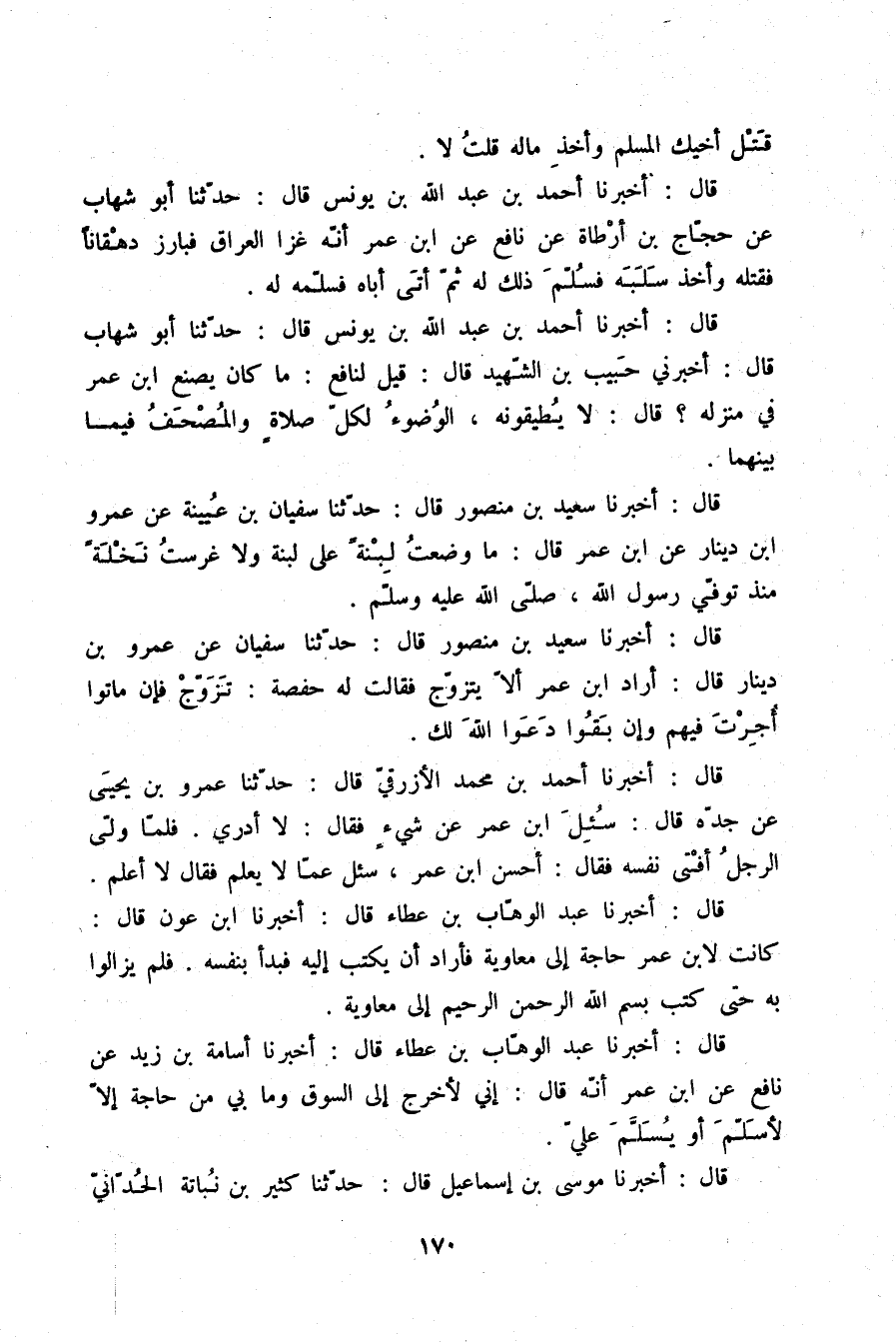 قَالَ: أَخْبَرَنَا عَبْدُ الْوَهَّابِ بْنُ عَطَاءٍ قَالَ: أَخْبَرَنَا أُسَامَةُ بْنُ زَيْدٍ، عَنْ نَافِعٍ، عَنِ ابْنِ عُمَرَ أَنَّهُ قَالَ: إِنِّي §لَأَخْرُجُ إِلَى السُّوقِ وَمَا بِي مِنْ حَاجَةٌ إِلَّا لَأُسَلِّمَ أَوْ يُسَلَّمَ عَلَيَّ