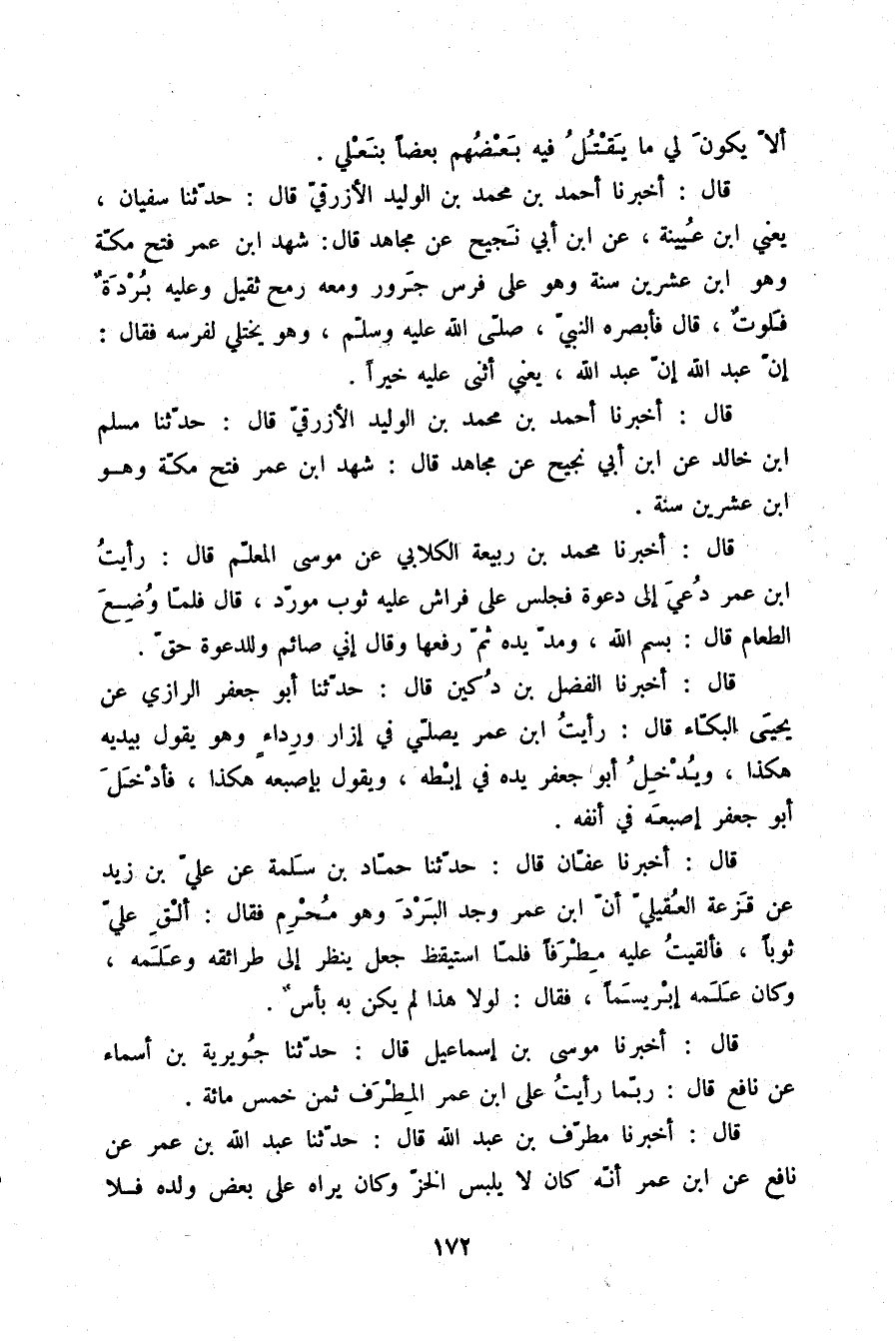 قَالَ: أَخْبَرَنَا أَحْمَدُ بْنُ مُحَمَّدِ بْنِ الْوَلِيدِ الْأَزْرَقِيُّ قَالَ: حَدَّثَنَا سُفْيَانُ يَعْنِي ابْنَ عُيَيْنَةَ، عَنِ ابْنِ أَبِي نَجِيحٍ، عَنْ مُجَاهِدٍ قَالَ: شَهِدَ ابْنُ عُمَرَ فَتْحَ مَكَّةَ , وَهُوَ ابْنُ عِشْرِينَ سَنَةً , وَهُوَ عَلَى فَرَسٍ جَرُورٍ , وَمَعَهُ رُمْحٌ ثَقِيلٌ , وَعَلَيْهِ بُرْدَةٌ فَلُوتٌ , قَالَ: فَأَبْصَرَهُ النَّبِيُّ صَلَّى اللَّهُ عَلَيْهِ: وَسَلَّمَ وَهُوَ يَخْتَلِي لِفَرَسِهِ , فَقَالَ: «إِنَّ §عَبْدَ اللَّهِ، إِنَّ عَبْدَ اللَّهِ» يَعْنِي أَثْنَى عَلَيْهِ خَيْرًا