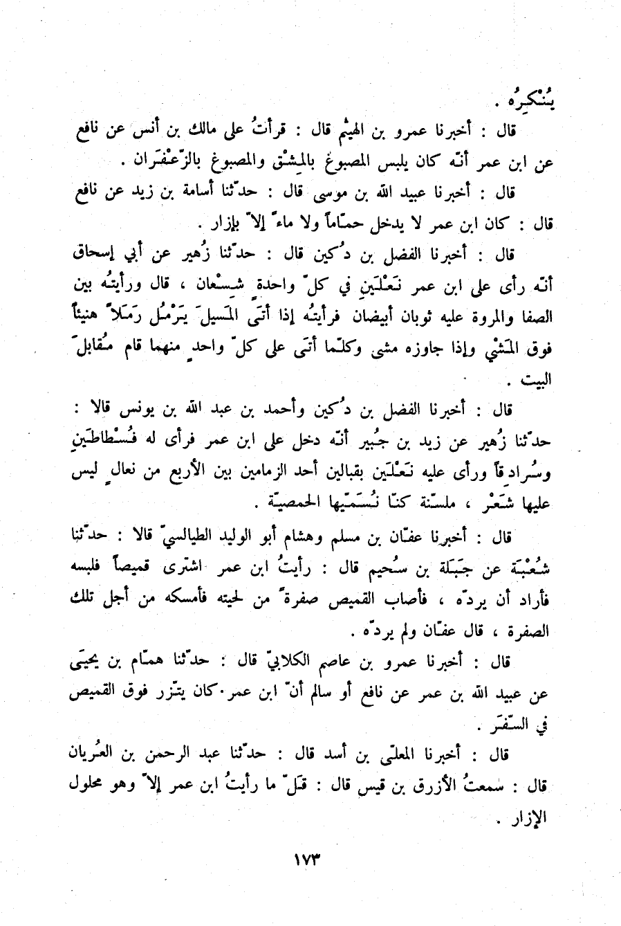 قَالَ: أَخْبَرَنَا عُبَيْدُ اللَّهِ بْنُ مُوسَى قَالَ: حَدَّثَنَا أُسَامَةُ بْنُ زَيْدٍ، عَنْ نَافِعٍ قَالَ: كَانَ §ابْنُ عُمَرَ لَا يَدْخُلُ حَمَّامًا وَلَا مَاءً إِلَّا بِإِزَارٍ
