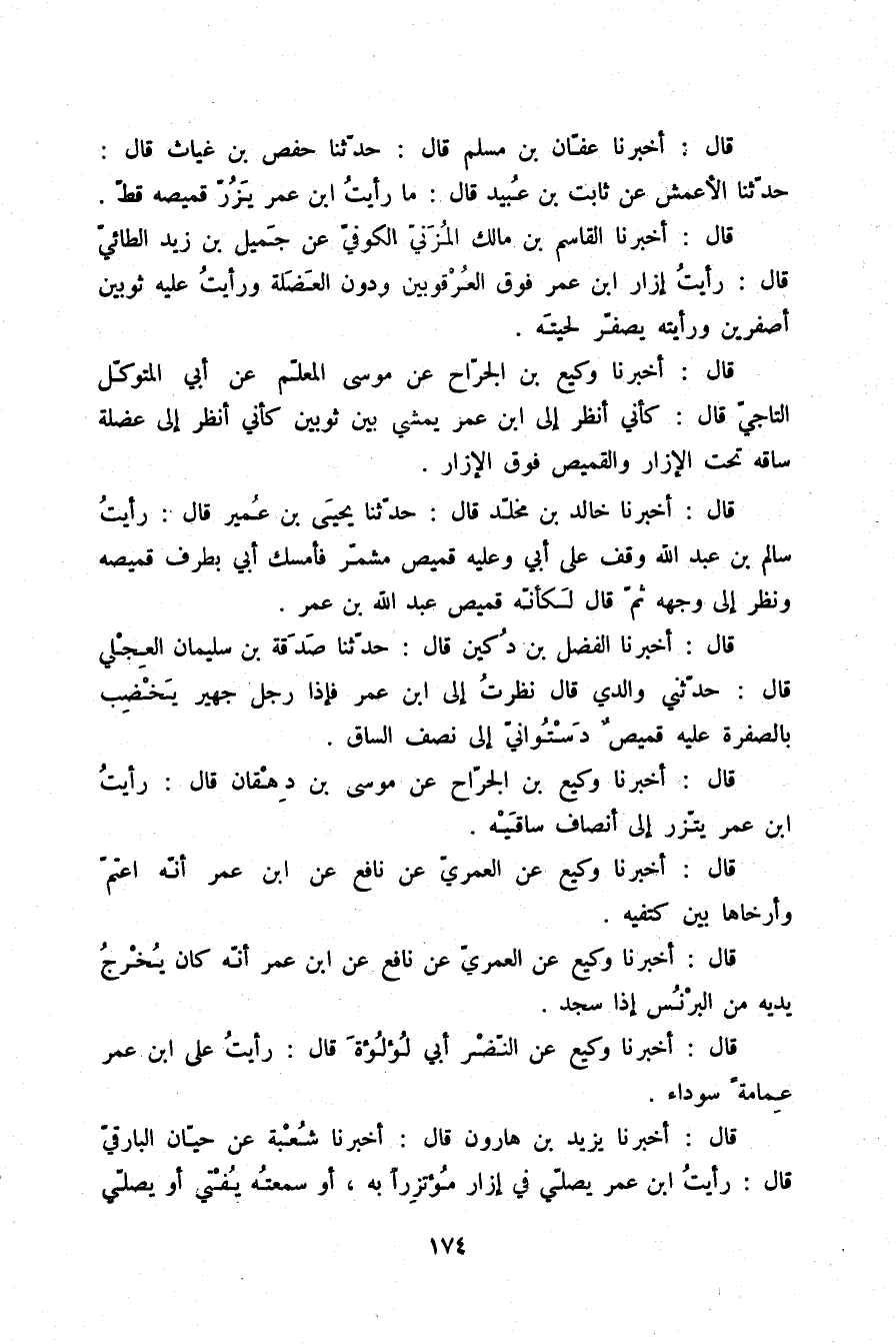 قَالَ: أَخْبَرَنَا وَكِيعُ بْنُ الْجَرَّاحِ، عَنْ مُوسَى بْنِ دِهْقَانَ قَالَ: رَأَيْتُ §ابْنَ عُمَرَ يَتَّزِرُ إِلَى أَنْصَافِ سَاقَيْهِ