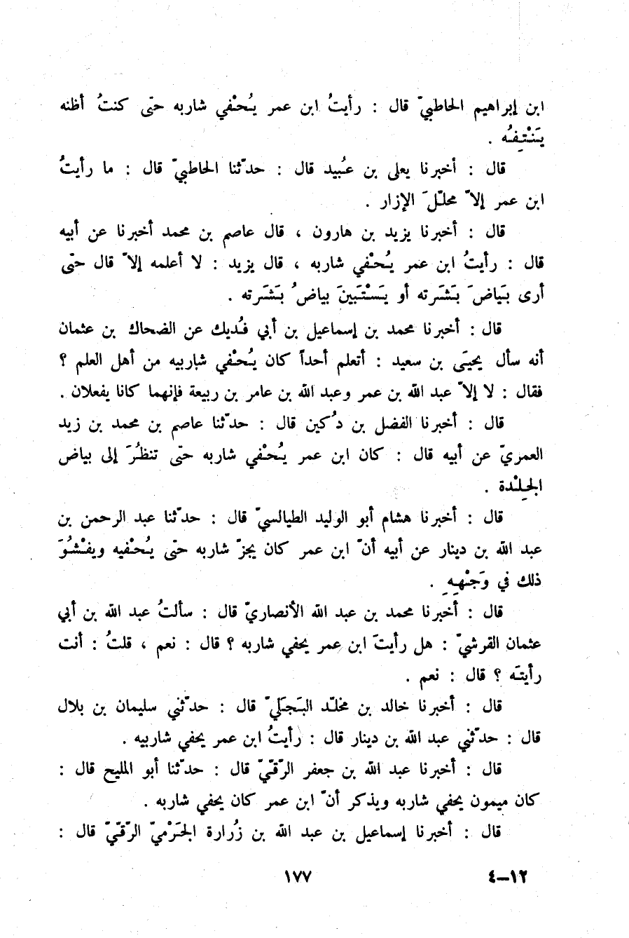 قَالَ: أَخْبَرَنَا يَعْلَى بْنُ عُبَيْدٍ قَالَ: حَدَّثَنَا الْحَاطِبِيُّ قَالَ: مَا رَأَيْتُ §ابْنَ عُمَرَ إِلَّا مُحِلَّ الْإِزَارِ
