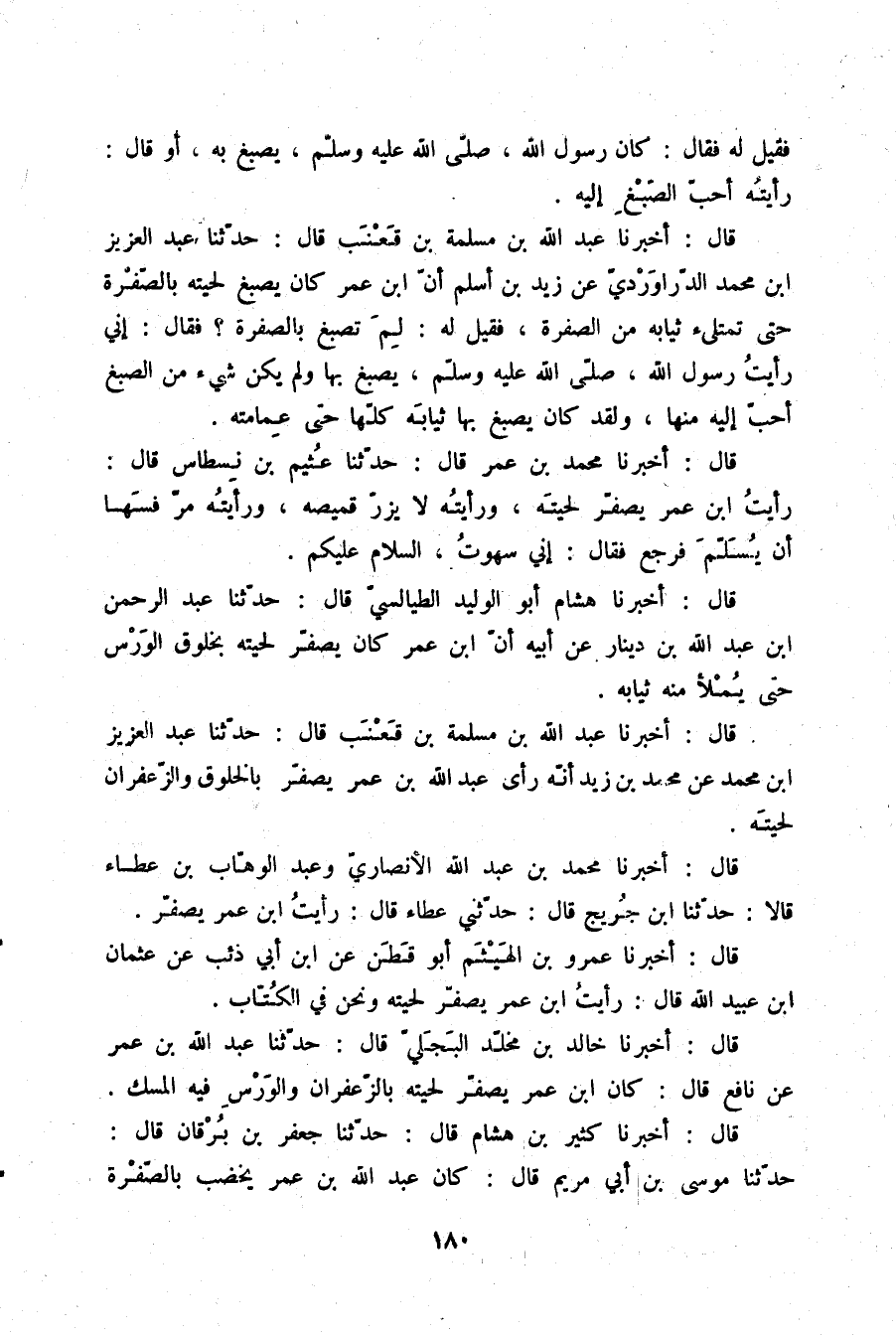 قَالَ: أَخْبَرَنَا عَبْدُ اللَّهِ بْنُ مَسْلَمَةَ بْنِ قَعْنَبٍ قَالَ: حَدَّثَنَا عَبْدُ الْعَزِيزِ بْنُ مُحَمَّدٍ، عَنْ مُحَمَّدِ بْنِ زَيْدٍ أَنَّهُ رَأَى §عَبْدَ اللَّهِ بْنَ عُمَرَ يُصَفِّرُ بِالْخَلُوقِ وَالزَّعْفَرَانِ لِحْيَتَهُ