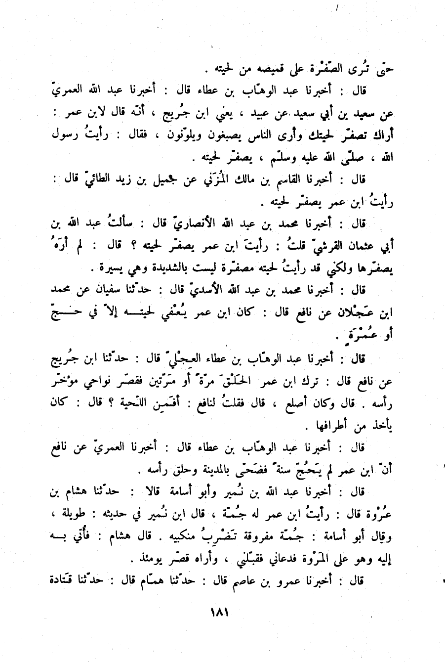 قَالَ: أَخْبَرَنَا مُحَمَّدُ بْنُ عَبْدِ اللَّهِ الْأَنْصَارِيُّ قَالَ: سَأَلْتُ عَبْدَ اللَّهِ بْنَ أَبِي عُثْمَانَ الْقُرَشِيَّ قُلْتُ: رَأَيْتَ §ابْنَ عُمَرَ يُصَفِّرُ لِحْيَتَهُ؟ قَالَ: لَمْ أَرَهْ يُصَفِّرُهَا , وَلَكِنِّي قَدْ رَأَيْتُ لِحْيَتَهُ مُصْفَرَّةً , لَيْسَتْ بِالشَّدَيدَةِ وَهِيَ يَسِيرَةٌ