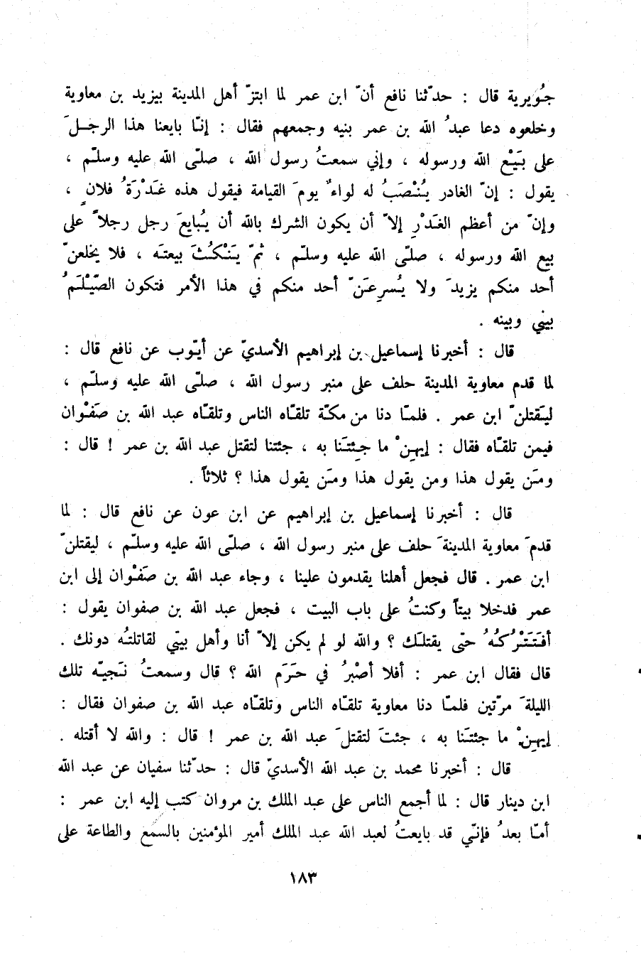 قَالَ: أَخْبَرَنَا إِسْمَاعِيلُ بْنُ إِبْرَاهِيمَ الْأَسَدِيُّ، عَنْ أَيُّوبَ، عَنْ نَافِعٍ قَالَ: لَمَّا قَدِمَ مُعَاوِيَةُ الْمَدِينَةَ §حَلَفَ عَلَى مِنْبَرِ رَسُولِ اللَّهِ صلّى الله عليه وسلم لَيُقْتَلَنَّ ابْنَ عُمَرَ , فَلَمَّا دَنَا مِنْ مَكَّةَ تَلَقَّاهُ النَّاسُ وَتَلَقَّاهُ عَبْدُ اللَّهِ بْنُ صَفْوَانَ فِيمَنْ تَلَقَّاهُ , فَقَالَ: إِيهِنْ مَا جِئْتَنَا بِهِ، جِئْتَنَا لِتَقْتُلَ عَبْدَ اللَّهِ بْنَ عُمَرَ؟ قَالَ: وَمَنْ يَقُولُ هَذَا؟ وَمَنْ يَقُولُ هَذَا؟ وَمَنْ يَقُولُ هَذَا؟ ثَلَاثًا