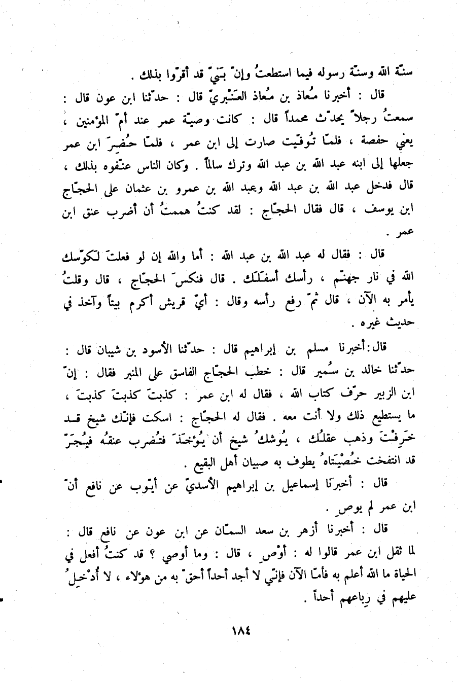 قَالَ: أَخْبَرَنَا مُعَاذُ بْنُ مُعَاذٍ الْعَنْبَرِيُّ قَالَ: حَدَّثَنَا ابْنُ عَوْنٍ قَالَ: سَمِعْتُ رَجُلًا يُحَدِّثُ مُحَمَّدًا قَالَ: كَانَتْ وَصِيَّةُ عُمَرَ عِنْدَ أُمِّ الْمُؤْمِنِينَ يَعْنِي حَفْصَةَ , فَلَمَّا تُوُفِّيَتْ صَارَتْ إِلَى ابْنِ عُمَرَ , فَلَمَّا حَضَرَ ابْنُ عُمَرَ جَعَلَهَا إِلَى ابْنِهِ عَبْدِ اللَّهِ بْنِ عَبْدِ اللَّهِ، وَتَرَكَ سَالِمًا , وَكَانَ النَّاسُ عَنَّفُوهُ بِذَلِكَ , قَالَ: فَدَخَلَ عَبْدُ اللَّهِ بْنُ عَبْدِ اللَّهِ، وَعَبْدُ اللَّهِ بْنُ عَمْرِو بْنِ عُثْمَانَ عَلَى الْحَجَّاجِ بْنِ يُوسُفَ قَالَ: فَقَالَ الْحَجَّاجُ: لَقَدْ كُنْتُ §هَمَمْتُ أَنْ أَضْرِبَ عُنُقَ ابْنِ عُمَرَ، قَالَ: فَقَالَ لَهُ عَبْدُ اللَّهِ بْنُ عَبْدِ اللَّهِ: أَمَا وَاللَّهِ إِنْ لَوْ فَعَلَتَ لَكَوَّسَكَ اللَّهُ فِي نَارِ جَهَنَّمَ رَأْسُكَ أَسْفَلَكَ، قَالَ: فَنَكَّسَ الْحَجَّاجُ قَالَ: وَقُلْتُ: يَأْمُرُ بِهِ الْآنَ، قَالَ: ثُمَّ رَفَعَ رَأْسَهُ، وَقَالَ: أَيُّ قُرَيْشٍ أَكْرَمُ بَيْتًا، وَأَخَذَ فِي حَدِيثٍ غَيْرِهِ