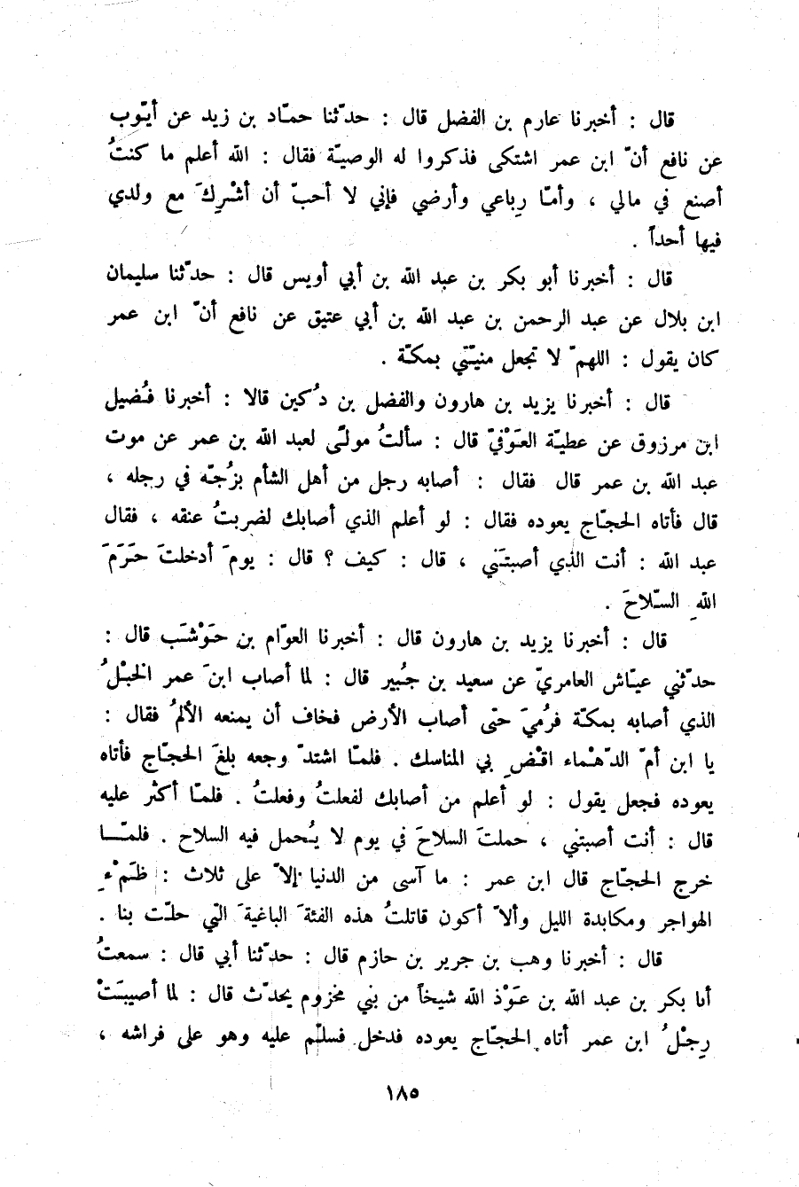 قَالَ: أَخْبَرَنَا يَزِيدُ بْنُ هَارُونَ قَالَ: أَخْبَرَنَا الْعَوَّامُ بْنُ حَوْشَبٍ قَالَ: حَدَّثَنِي عَيَّاشٌ الْعَامِرِيُّ، عَنْ سَعِيدِ بْنِ جُبَيْرٍ قَالَ: لَمَّا أَصَابَ ابْنَ عُمَرَ الْخَبْلُ الَّذِي أَصَابَهُ بِمَكَّةَ , فَرُمِيَ حَتَّى أَصَابَ الْأَرْضَ، فَخَافَ أَنْ يَمْنَعَهُ الْأَلَمُ , فَقَالَ: يَا ابْنَ أُمِّ الدَّهْمَاءِ اقْضِ بِيَ الْمَنَاسِكَ. فَلَمَّا اشْتَدَّ وَجَعُهُ بَلَغَ الْحَجَّاجَ , فَأَتَاهُ يَعُودُهُ , فَجَعَلَ يَقُولُ: لَوْ أَعْلَمُ مَنْ أَصَابَكَ لَفَعَلْتُ وَفَعَلْتُ، فَلَمَّا أَكْثَرَ عَلَيْهِ، قَالَ: أَنْتَ §أَصَبْتَنِي حَمَلْتَ السِّلَاحَ فِي يَوْمٍ لَا يُحْمَلُ فِيهِ السِّلَاحُ، فَلَمَّا خَرَجَ الْحَجَّاجُ , قَالَ ابْنُ عُمَرَ: مَا آسَى مِنَ الدُّنْيَا إِلَّا عَلَى ثَلَاثٍ ظِمَإِ الْهَوَاجِرِ، وَمُكَابَدَةِ اللَّيْلِ، وَأَلَّا أَكُونَ قَاتَلْتُ هَذِهِ الْفِئَةَ الْبَاغِيَةَ الَّتِي حَلَّتْ بِنَا